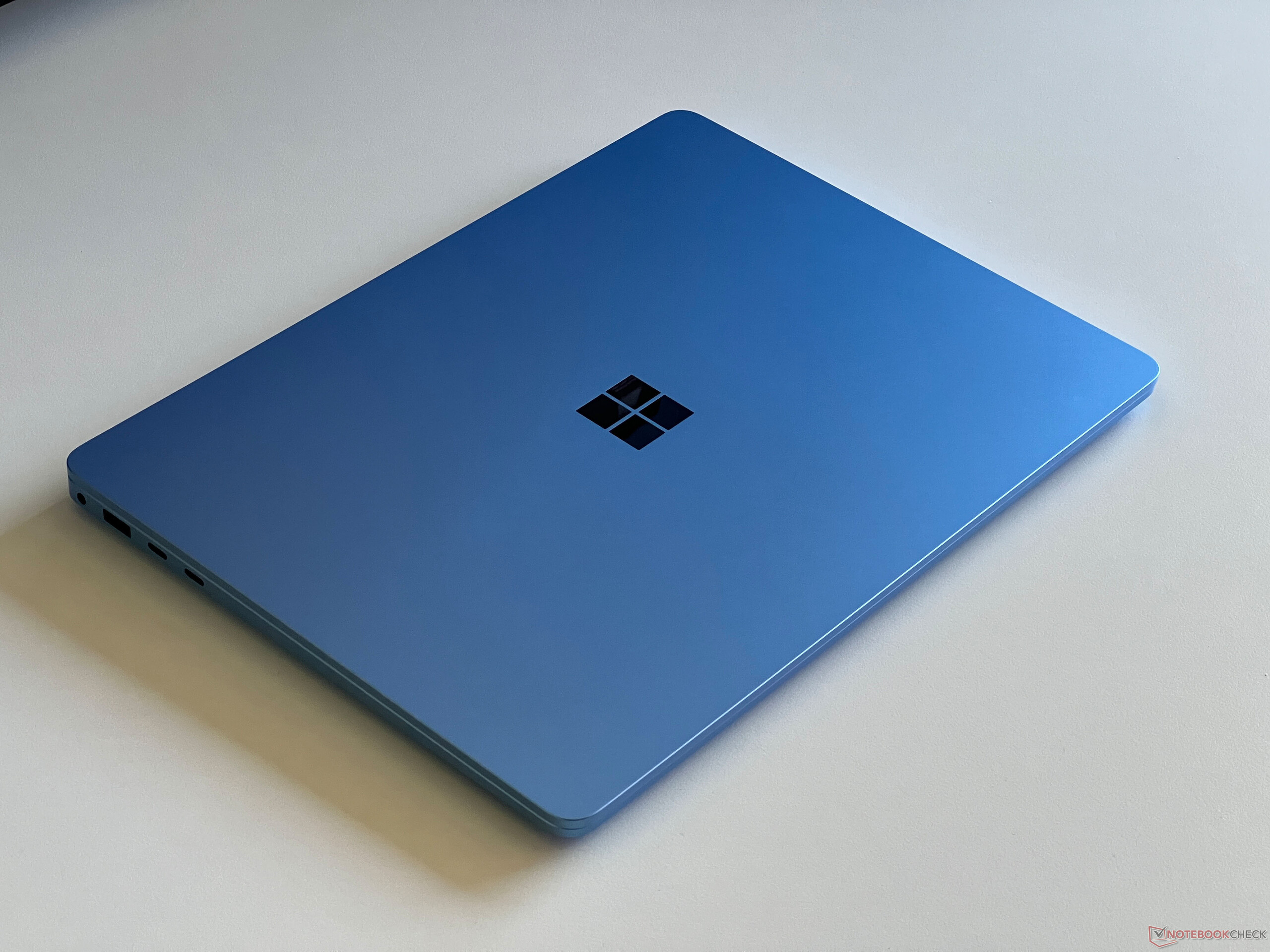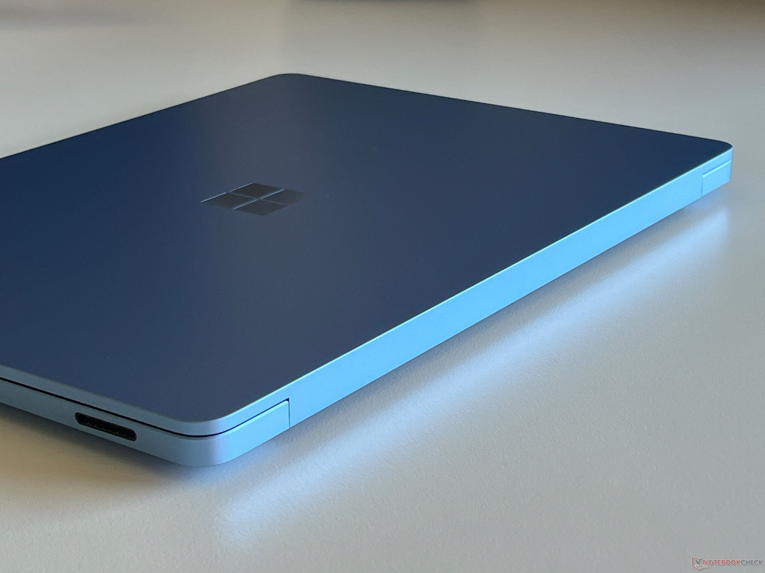 Nada mudou em relação ao design da sétima geração do Surface Laptop e, externamente, o senhor não saberá dizer se está lidando com um novo modelo Snapdragon. Isso só fica evidente com o novo botão Copilot. A caixa de metal ainda é maravilhosamente construída e a Microsoft oferece o laptop nas cores preto, platina, cinza-bege ou azul-safira, que é a cor do nosso dispositivo de análise. Dependendo de como a luz incide, o modelo azul safira é muito chamativo e nós gostamos dele. Além disso, não há problemas com impressões digitais.