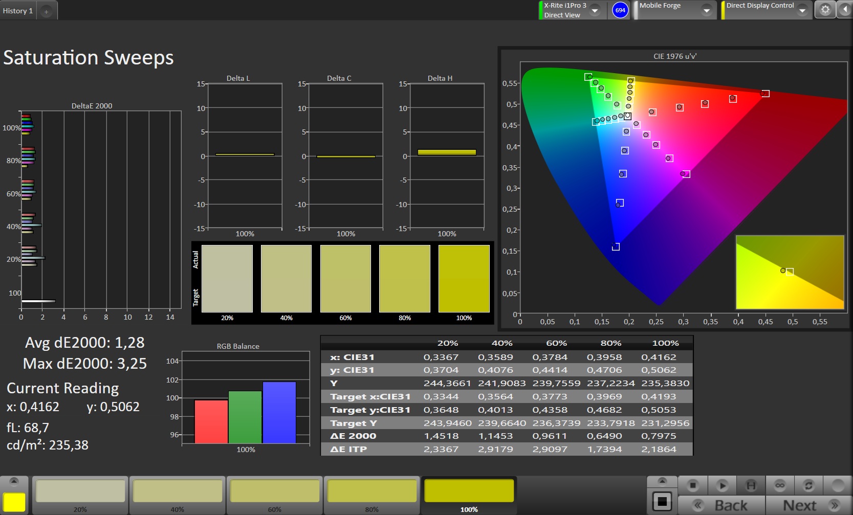 A precisão das cores continua excelente, com desvios pouco perceptíveis dos valores de referência.