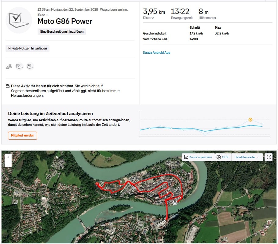 Em ambientes externos, o Moto G86 Power fixa rapidamente sua posição em cerca de três metros. Durante nosso teste de ciclismo, a precisão da localização foi ocasionalmente um pouco baixa, mas o smartphone ainda é preciso o suficiente para a navegação diária.