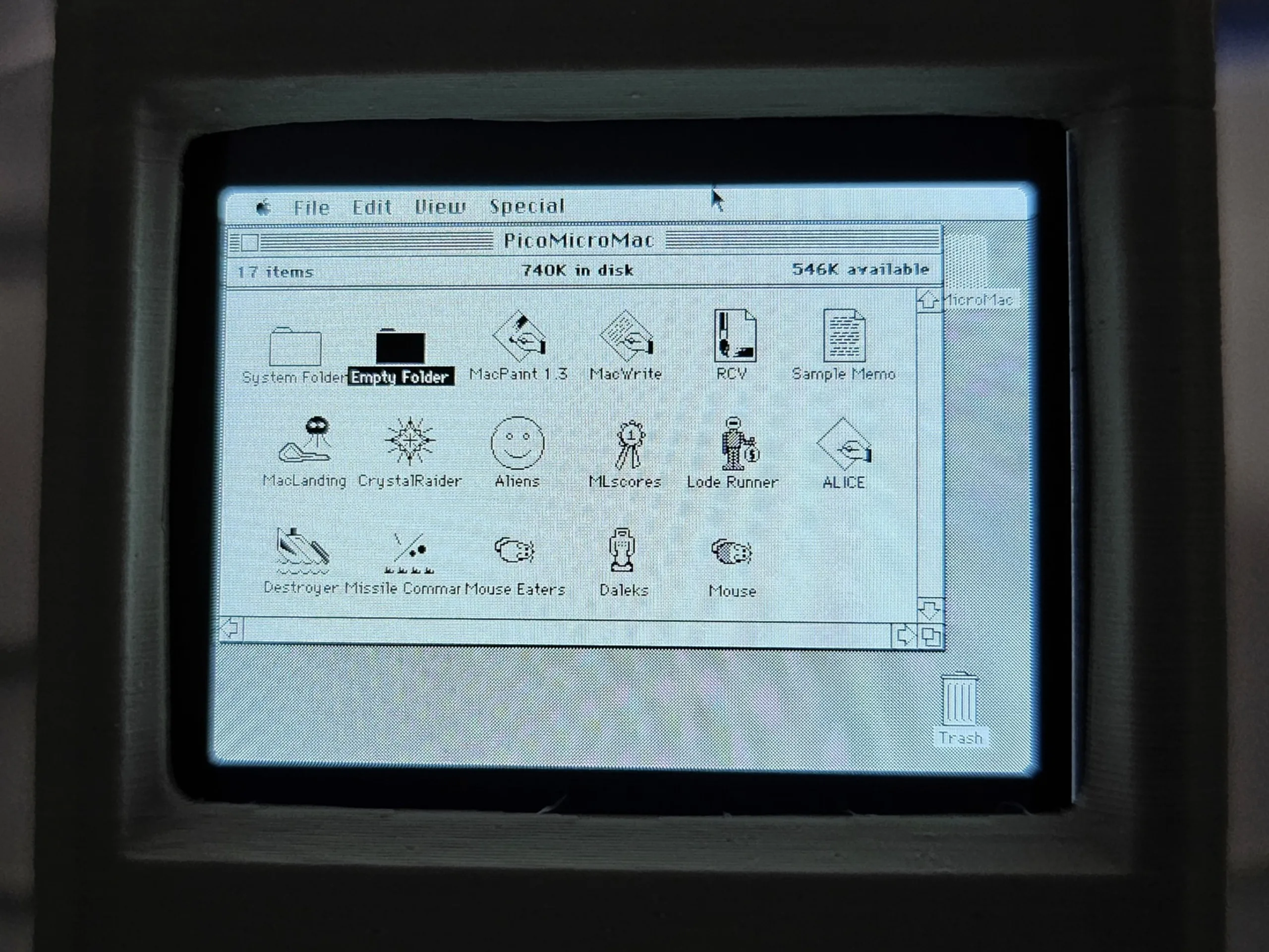 | Raspberry Pi Pico modificado com firmware atualizado e disco de inicialização do Macintosh System 3.2 pré-instalado |