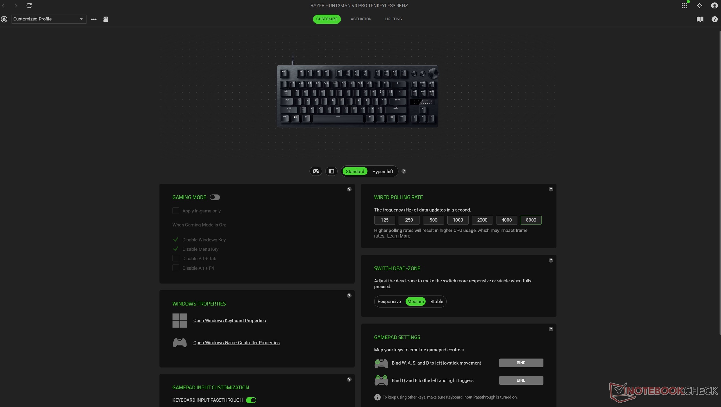 O Huntsman atualizado está repleto de recursos, o que pode tornar a navegação pelos menus do Synapse intimidadora. Mesmo assim, a Razer conseguiu dividir o aplicativo em três guias: Personalização, Atuação e Iluminação. A personalização permite que os jogadores ajustem a taxa de pesquisa ou ativem e desativem opções como o Modo de Jogo.