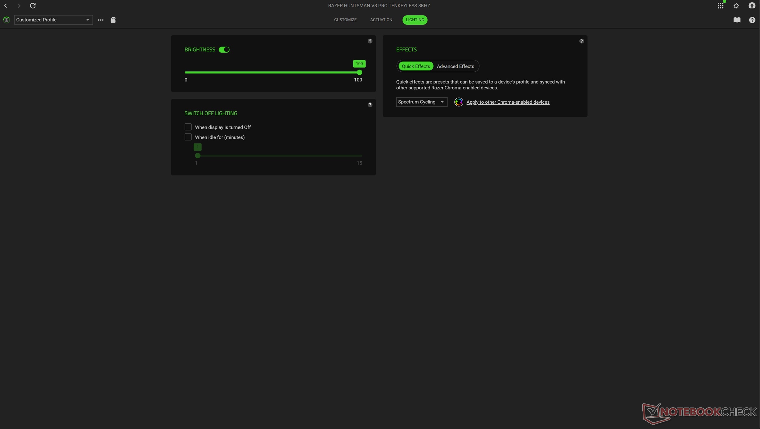 As opções de iluminação permanecem praticamente inalteradas, com efeitos básicos disponíveis no programa Synapse principal. É necessária uma interface separada do Chroma Studio para aproveitar todo o potencial da iluminação por tecla.