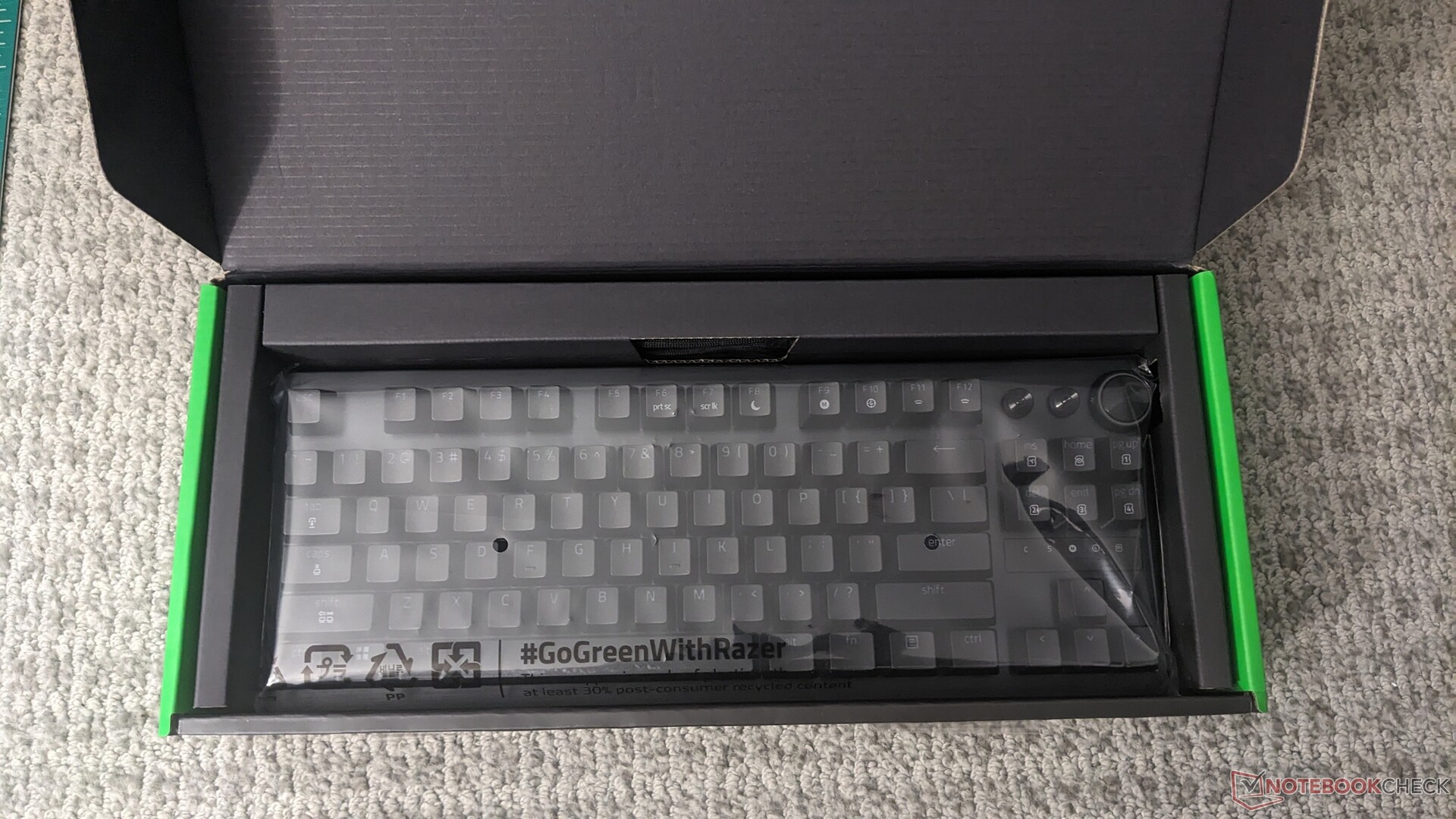 O mais recente teclado Razer é enviado em uma caixa retangular preta e verde. Em seu interior, os compradores encontrarão um cabo USB Tipo A para Tipo C destacável e trançado, um apoio de pulso magnético em couro sintético e um guia de início rápido.