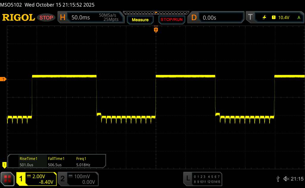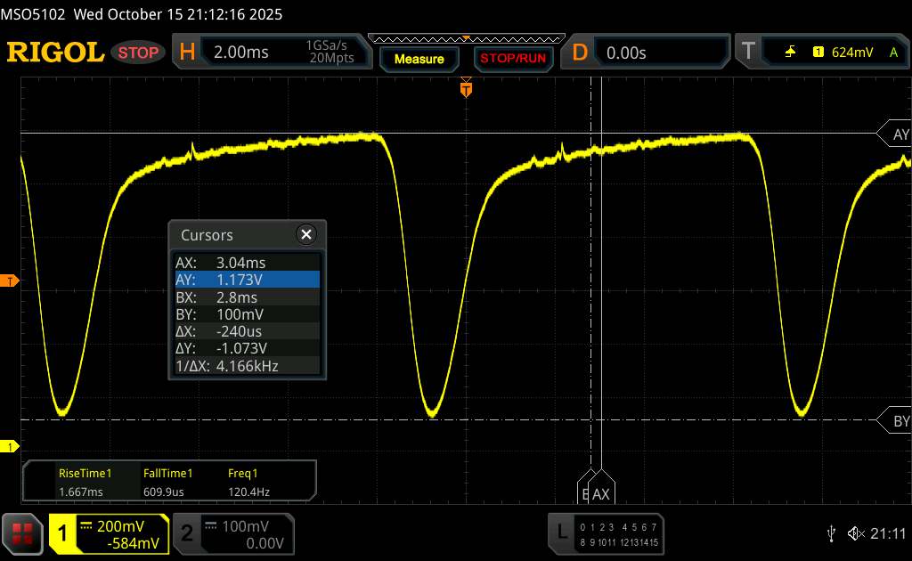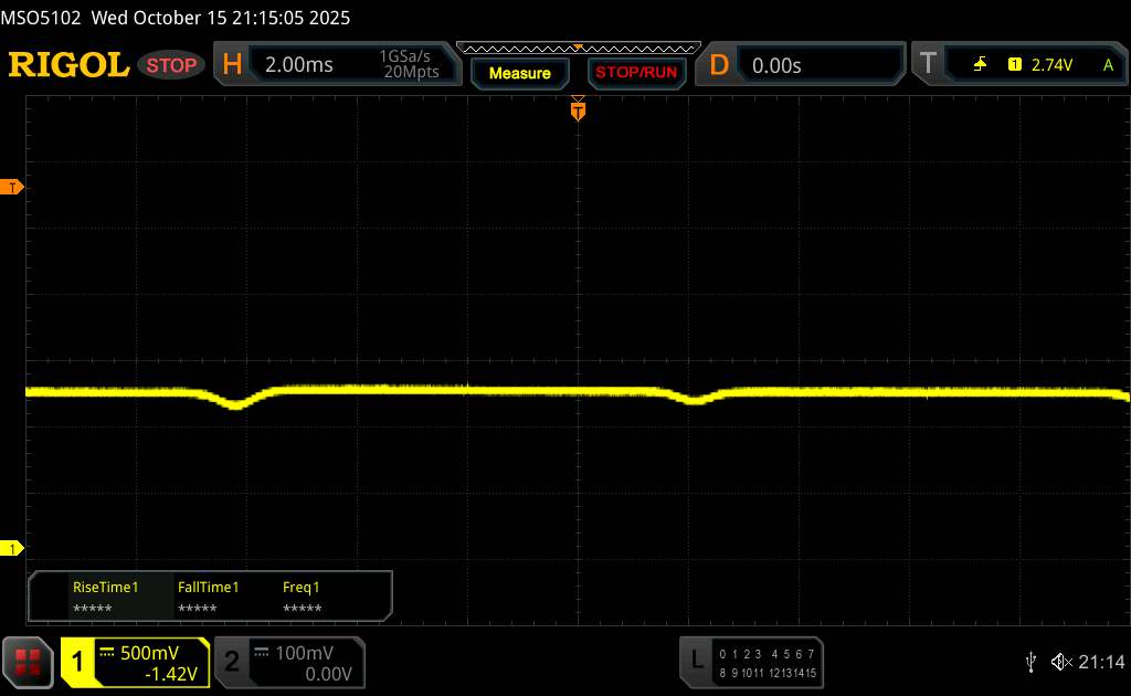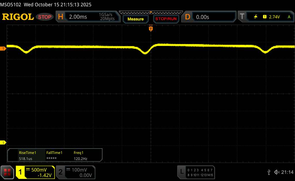 De acordo com as especificações, o 15T Pro usa escurecimento DC. No entanto, sob o osciloscópio, ele mostra, como o Xiaomi 15T, que, na verdade, depende do escurecimento PWM de alta frequência. O painel é geralmente agradável aos olhos, embora os usuários sensíveis ainda possam sentir um leve desconforto.