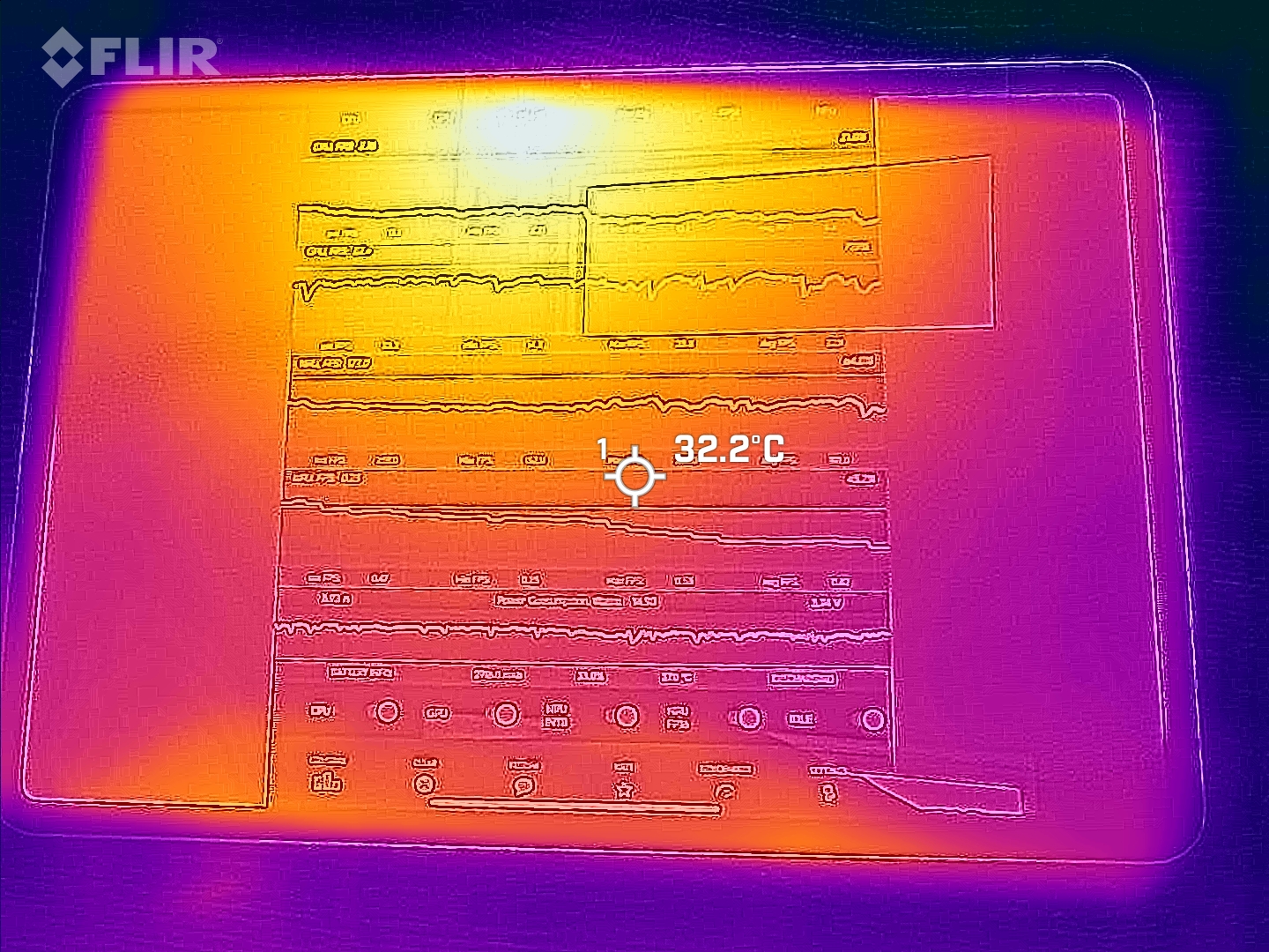 As temperaturas da superfície da carcaça do tablet são muito heterogêneas em nosso cenário de carga, mas também estão em um nível não crítico na área do ponto quente.