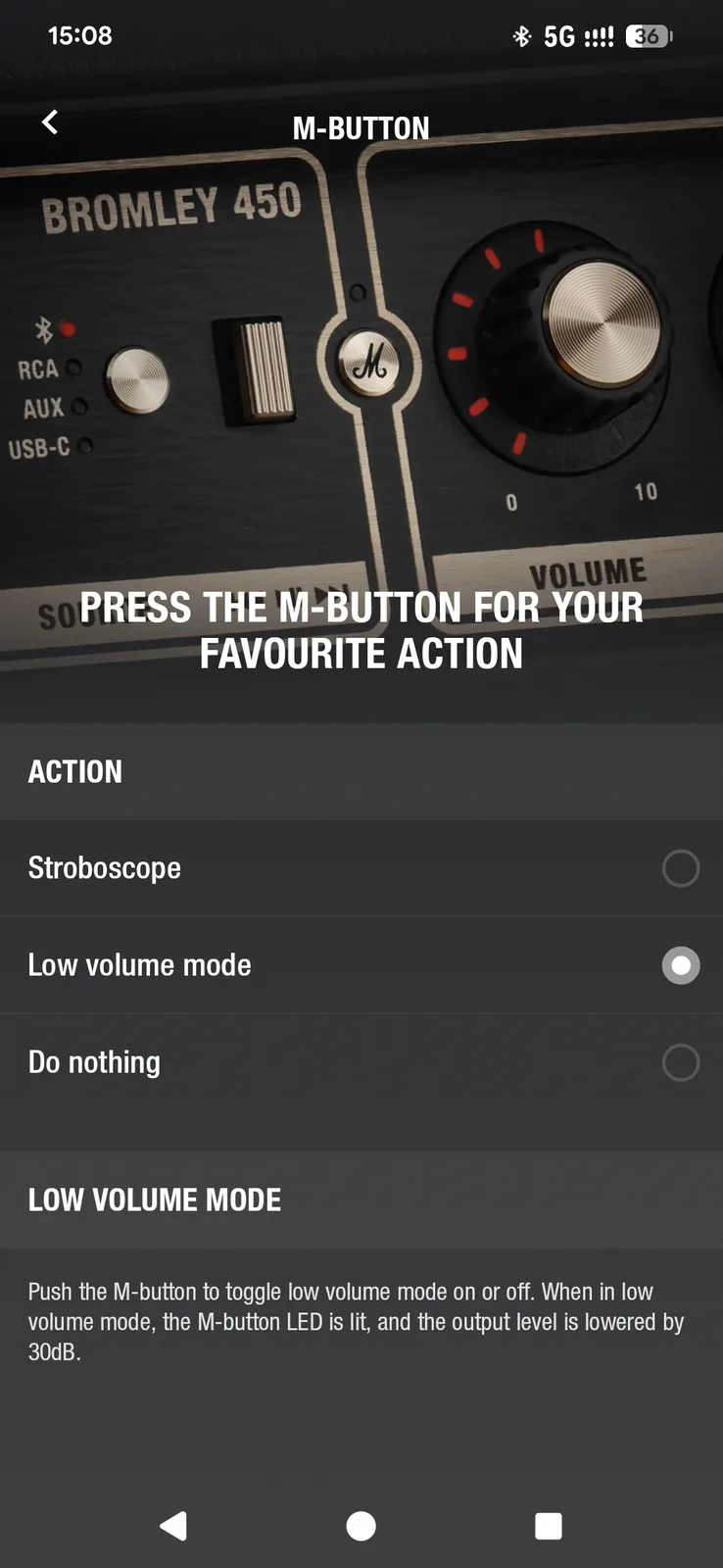 Para ambientes mais silenciosos - como uma varanda ou ambientes mais relaxados - há um modo de volume baixo que reduz a saída em 30 dB. Se desejar, o senhor pode atribuir essa função ao botão M.