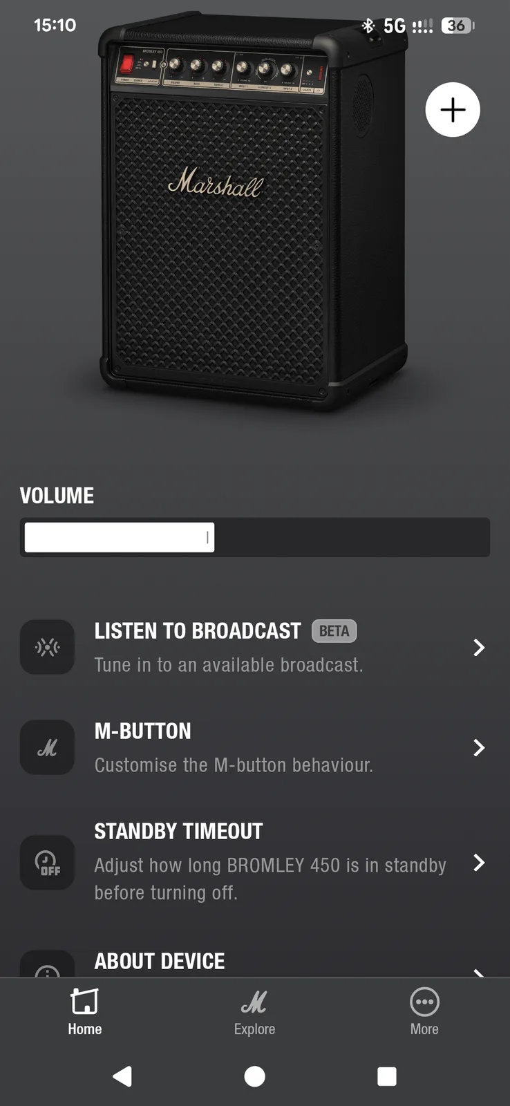 O Bromley usa o mesmo aplicativo que os fones de ouvido da Marshall. O aplicativo Marshall Bluetooth tem um visual limpo e é fácil de navegar, mas carece de recursos. O senhor precisará dele principalmente para o Auracast (conexão de vários alto-falantes compatíveis) e para configurar o botão M, que atualmente suporta apenas uma de duas funções atribuíveis. Além do controle de volume, não há muito que possa ser ajustado remotamente - nenhum EQ, nenhum ajuste de agudos ou graves.