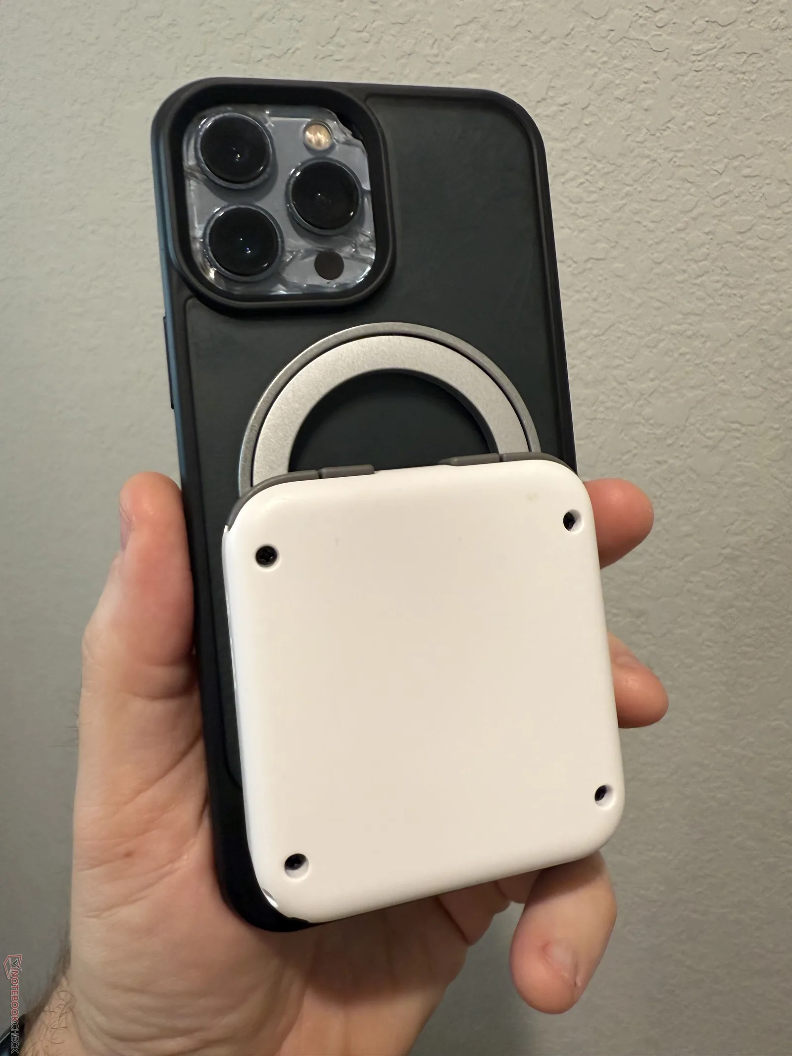 O ímã é uma peça separada do controlador, que se prende ao ímã e se alinha por meio de um pequeno pino na parte superior. No entanto, esse pino não é tão firme quanto se espera, especialmente com telefones maiores ou mais pesados. Em meus testes, um iPhone 13 parecia bem seguro, mas um iPhone 13 Pro Max e um iPhone 16 Pro Max pareciam instáveis e não estavam seguros. Dito isso, os telefones permaneceram no lugar, a menos que fossem intencionalmente sacudidos, caso em que o anel magnético se soltava do controlador.