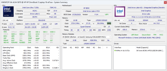 | HP Omnibook 5 16-af1037nr Intel Core Ultra 7 255U ⎘ Intel Graphics 4-Core iGPU (Meteor / Arrow Lake) ⎘ 16 GB Memória | Amazon: $1,225.00 Preço de tabela: 660 USD | 1.7 kg | 18.6 mm | 16.00" 1920x1200 142 PPI IPS | |