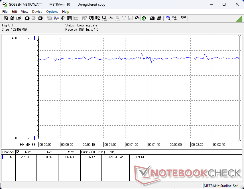 A execução do Prime95 consome cerca de 222 W em comparação com apenas 98 W no Razer Blade 16 com tecnologia AMD. Em outras palavras, nosso sistema Intel é 2,2 vezes mais exigente do que o Razer, ao mesmo tempo em que oferece um aumento de 1,5 vezes no desempenho multi-thread para um desempenho geralmente mais baixo por watt. Esse grande delta continua durante a execução de jogos como Cyberpunk 2077 , em que nosso Lenovo consumiria cerca de 320 W, em comparação com apenas 178 W no Razer mencionado anteriormente.