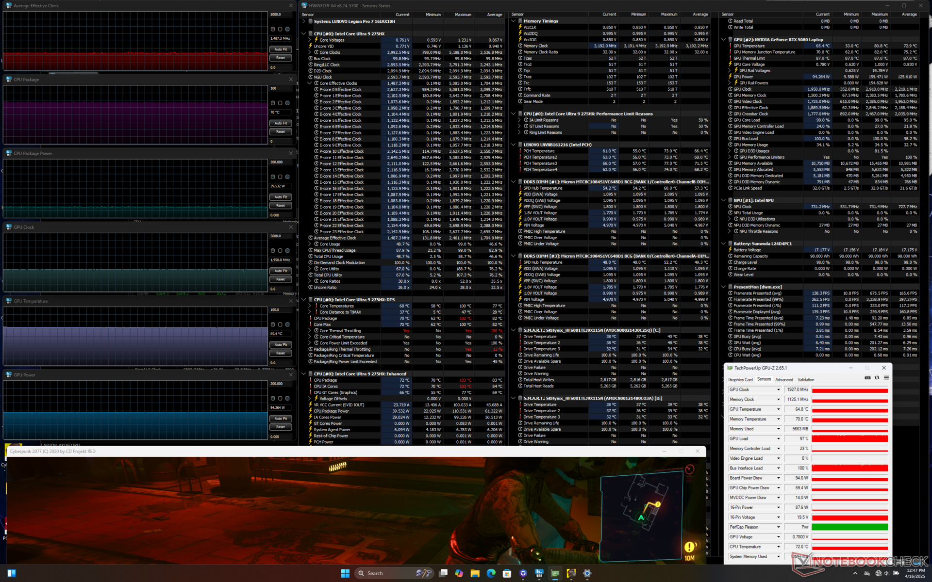 O uso de 400 W em um laptop de 16 polegadas tem suas desvantagens. Além do maior consumo de energia, alternativas mais finas e leves como o Asus ROG Zephyrus G16 ou o Razer Blade 16 podem ser mais atraentes para os viajantes, mesmo que sejam um pouco mais lentos. As temperaturas do núcleo do Lenovo podem ser bastante altas durante os jogos, apesar da grande solução de resfriamento, enquanto o ruído da ventoinha não é mais silencioso do que o dos concorrentes quando está no modo Desempenho.