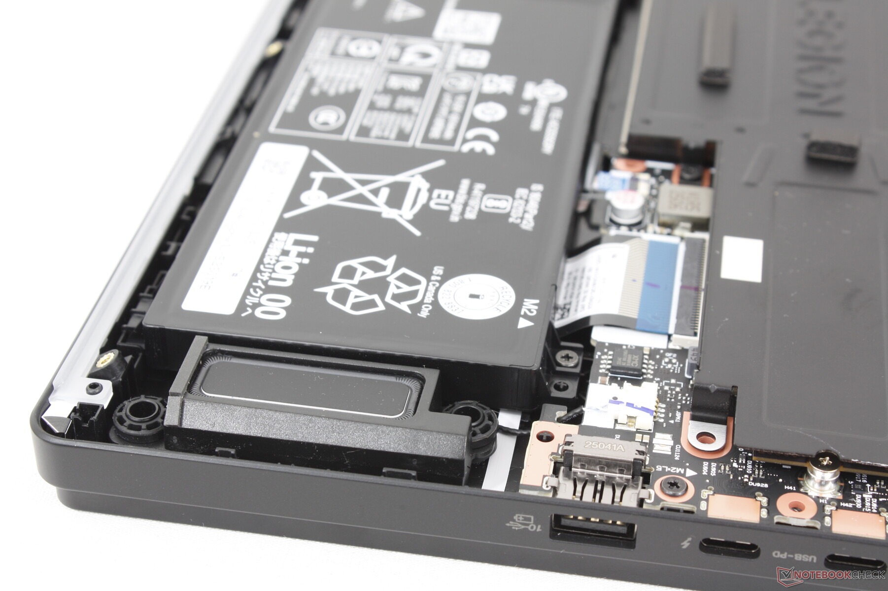 A manutenção é um pouco mais complexa do que o normal. Diferentemente da maioria dos outros notebooks, os dois slots SODIMM, os dois slots SSD M.2 e o módulo WLAN são cobertos por uma grande placa de alumínio, conforme mostrado abaixo, além da tampa externa. A remoção do aparelho é simples, desde que o usuário tenha cuidado para não rasgar o cabo de fita que conecta a terceira ventoinha à placa-mãe.