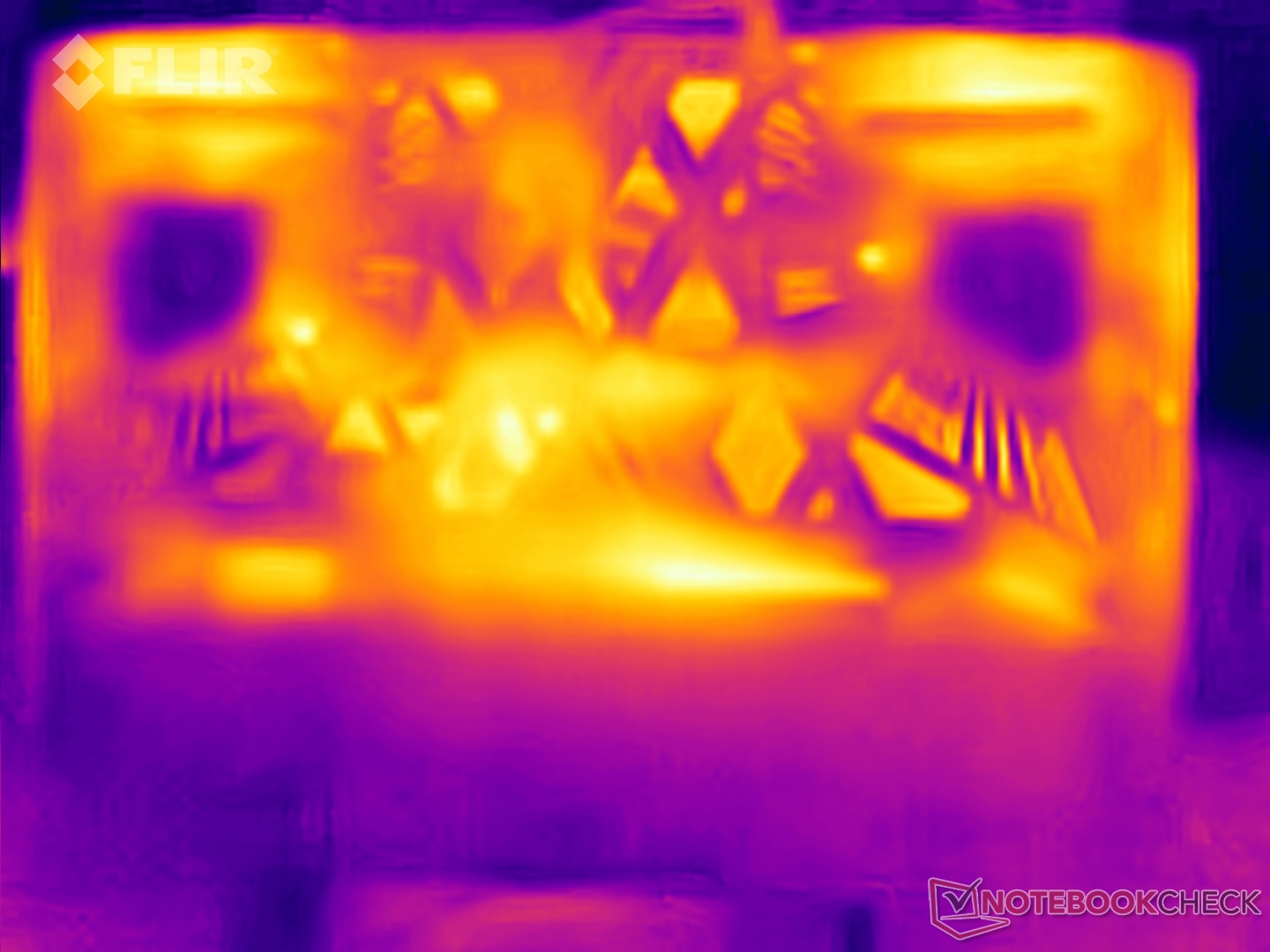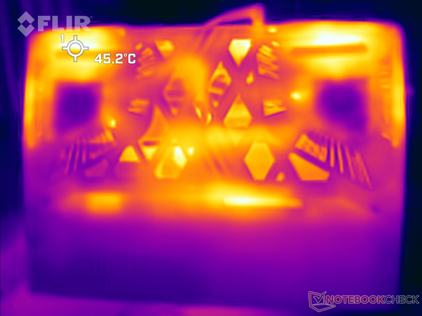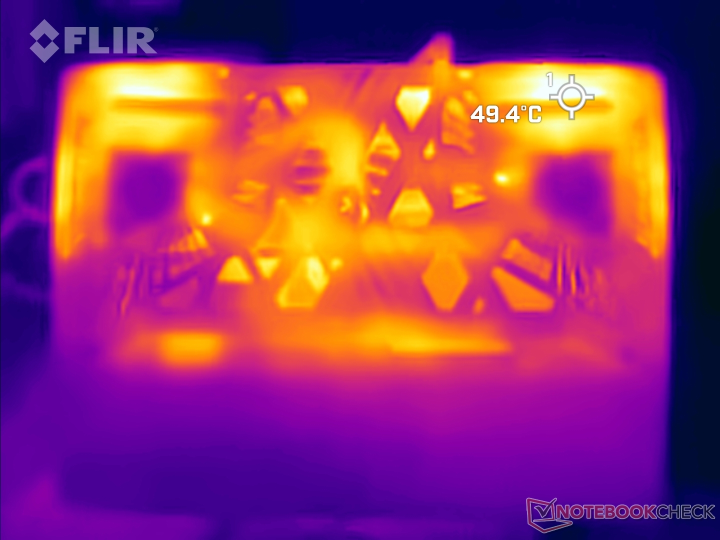 As temperaturas da superfície podem atingir até 45 °C na parte superior e quase 49 °C na parte inferior sob carga no modo Extreme Performance.