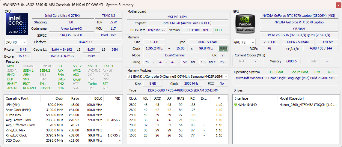 Nossa unidade Crosshair 16 HX AI conta com o Core Ultra 9 275HX e uma GPU para laptop RTX 5070 de 115 W, juntamente com 16 GB de memória DDR5-5600, um SSD NVMe de 1 TB e uma tela de nível IPS QHD+ de 240 Hz em um design familiar Crosshair 16 HX D14 chassi.
