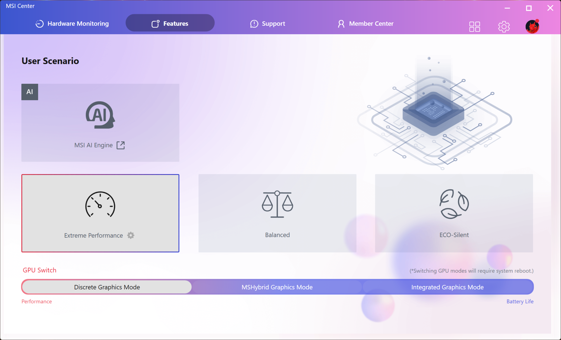 O modo Extreme Performance libera todo o potencial da Crosshair 16 HX AI, mas isso vem com a desvantagem do aumento das emissões de calor e ruído, além de maior consumo de energia.
