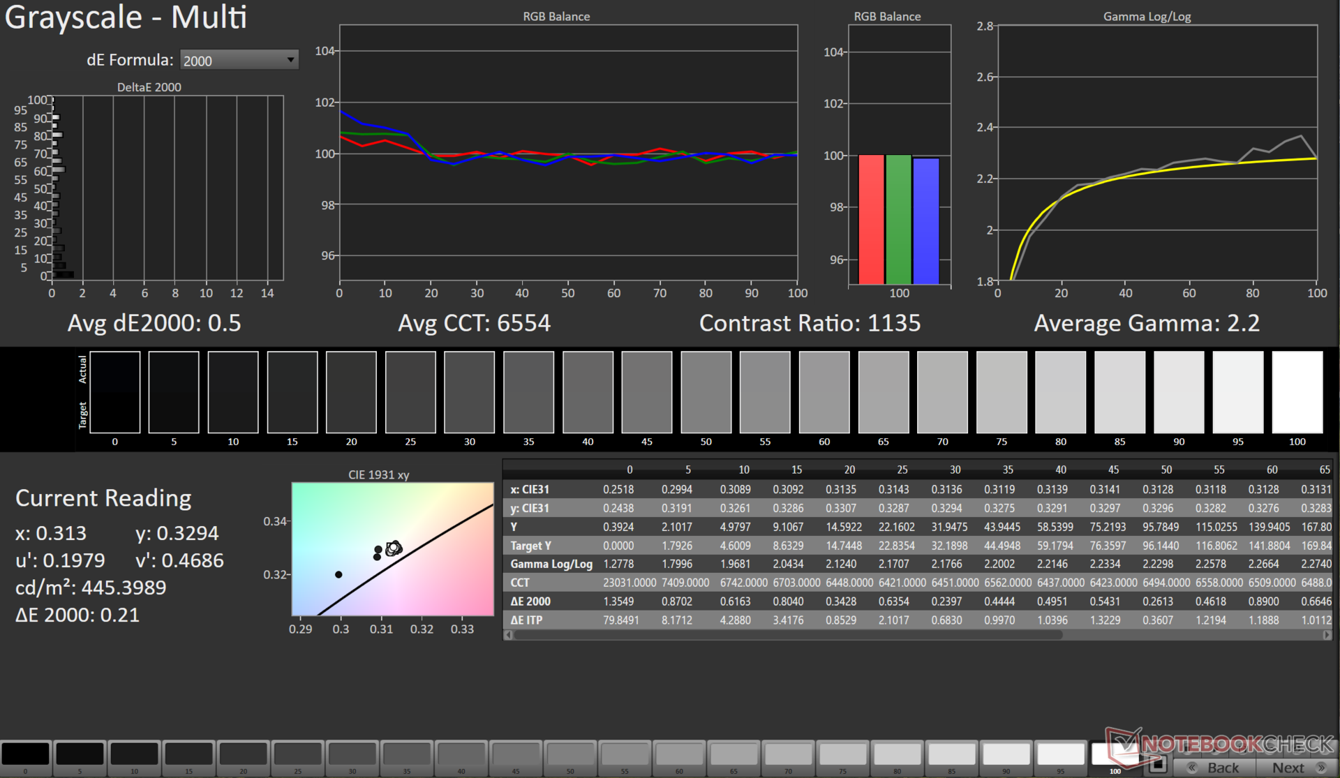 A taxa de contraste medida de 1.180:1 proporciona uma experiência de visualização subjetivamente boa com cobertura quase completa da gama de cores sRGB e Display P3.