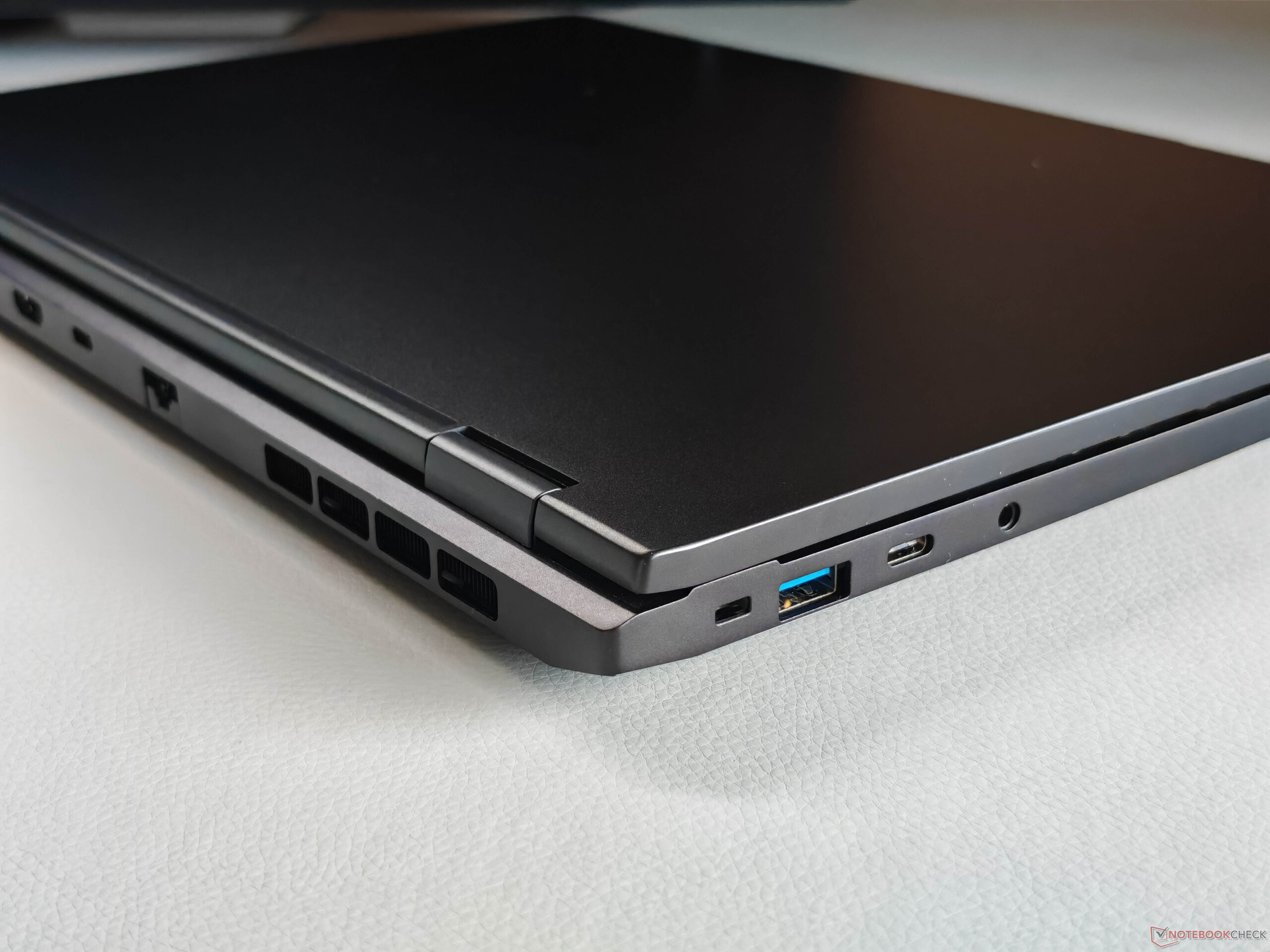 Não há mudanças no chassi em comparação com o modelo do ano passado modelo do ano passadoe o Evo 15 continua sendo um laptop muito fino e de alta qualidade. A carcaça de alumínio preto é muito bem construída e resistente, embora as impressões digitais se tornem visíveis rapidamente. As dobradiças (ângulo máximo de abertura) também são bem ajustadas, com apenas uma oscilação mínima.
