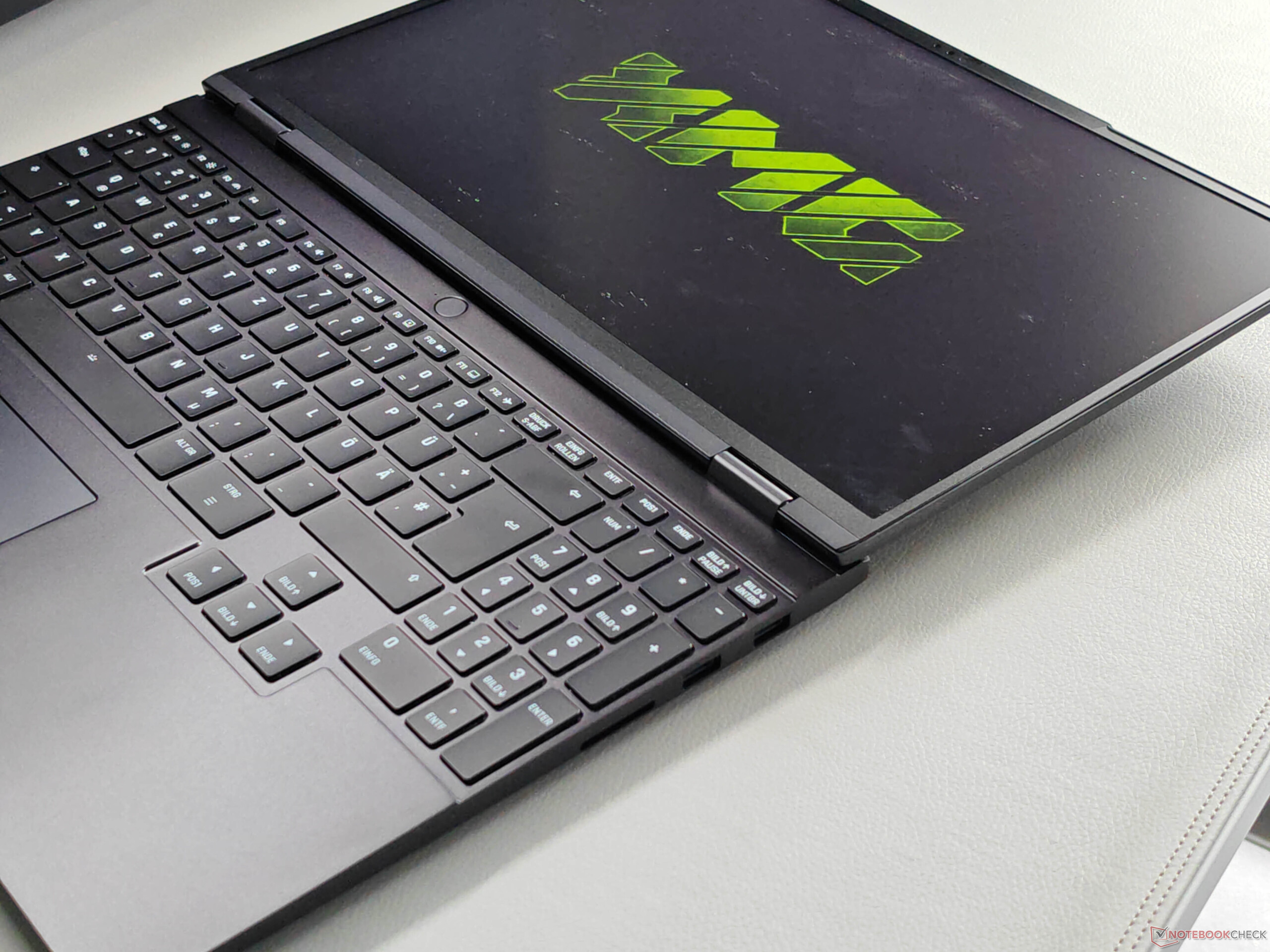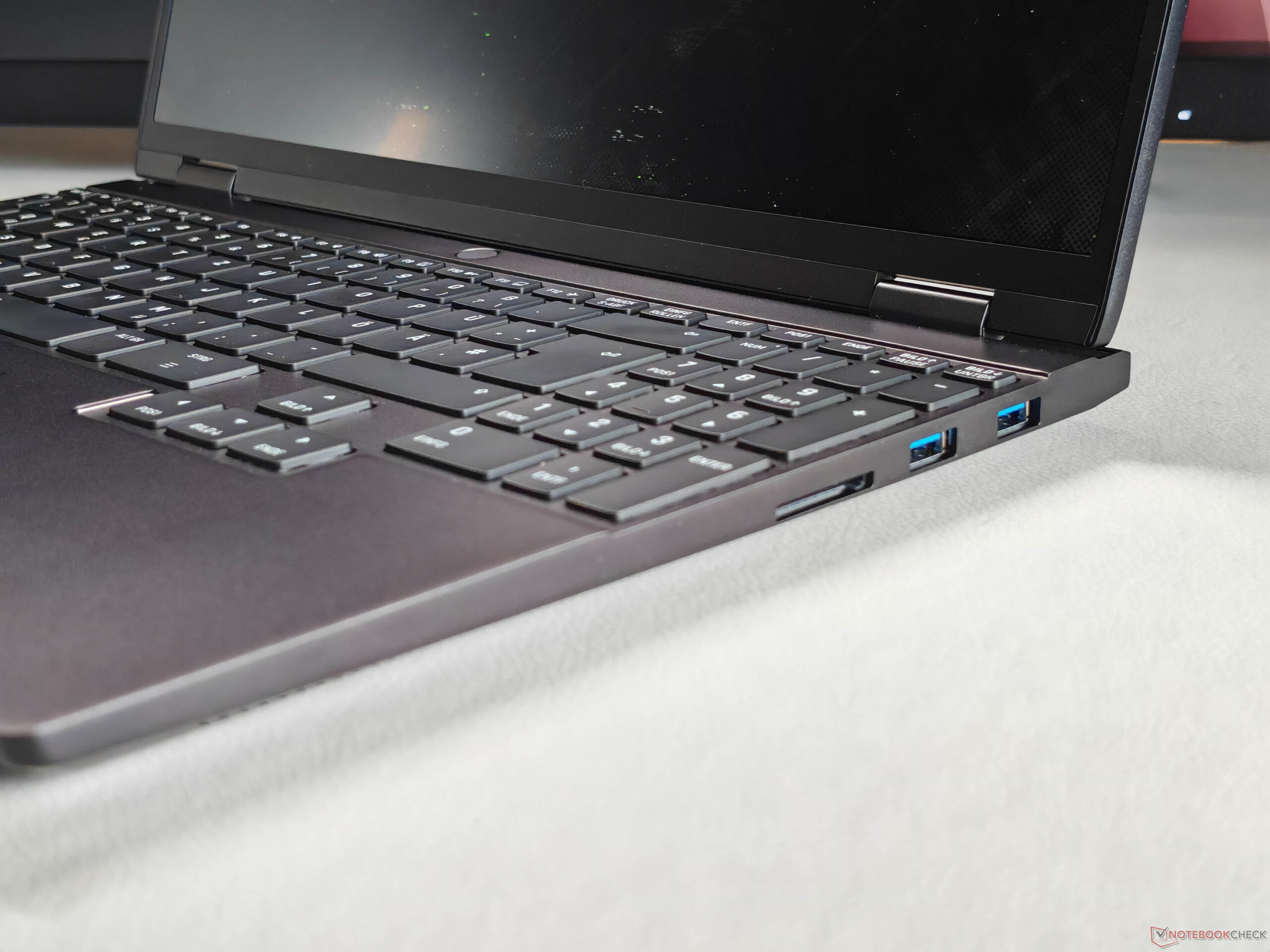 O teclado se estende por toda a largura do chassi e inclui um teclado numérico dedicado, bem como teclas de seta grandes. De modo geral, o conforto de digitação é muito bom e textos longos podem ser digitados sem problemas; apenas as teclas maiores são um pouco mais barulhentas. A luz de fundo branca oferece quatro níveis de brilho.