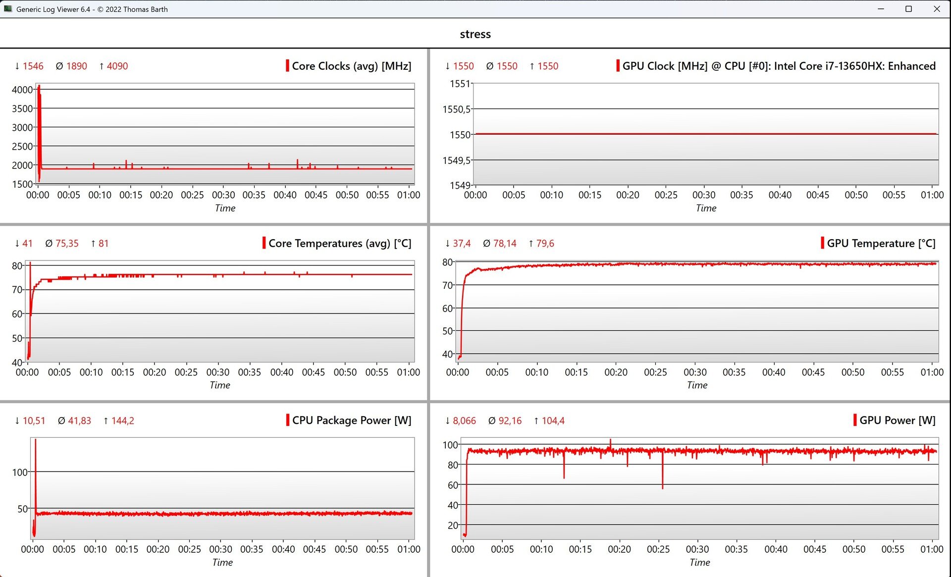 O Intel Core i7-13650HX (Raptor Lake) serve como processador, com limites de potência de 140 e 95 watts - significativamente mais altos do que os da versão AMD. No geral, porém, o desempenho da CPU é apenas ligeiramente melhor do que o chip Zen 4. No modo de bateria, o desempenho da CPU cai em cerca de 40%.