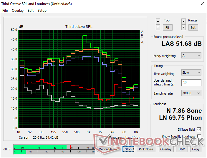 As ventoinhas estão sempre ativas, independentemente da carga na tela. Embora não seja muito alto, há um zumbido constante mesmo durante cargas baixas, como navegação na Web ou streaming de vídeo. Cargas mais altas, como jogos, podem aumentar o ruído da ventoinha em até 50 dB(A), sendo mais alto do que na maioria dos laptops ultrafinos.