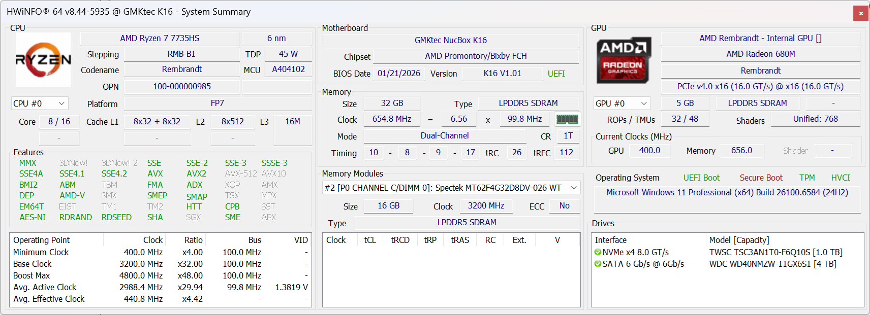 | GMK NucBox K16 AMD Ryzen 7 7735HS ⎘ AMD Radeon 680M ⎘ 32 GB Memória, 1024 GB SSD | Preço de tabela: 650 USD | 567 g | 63 mm | x | |
