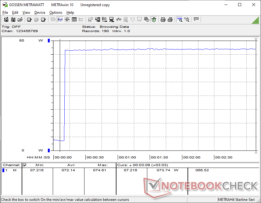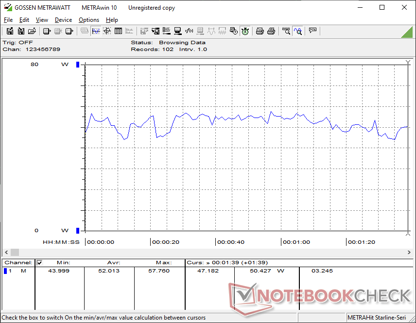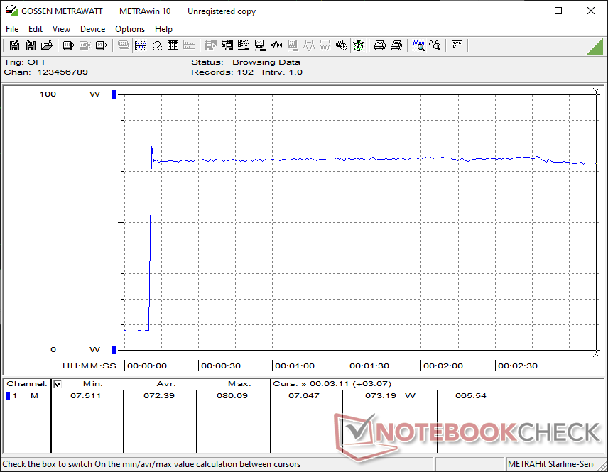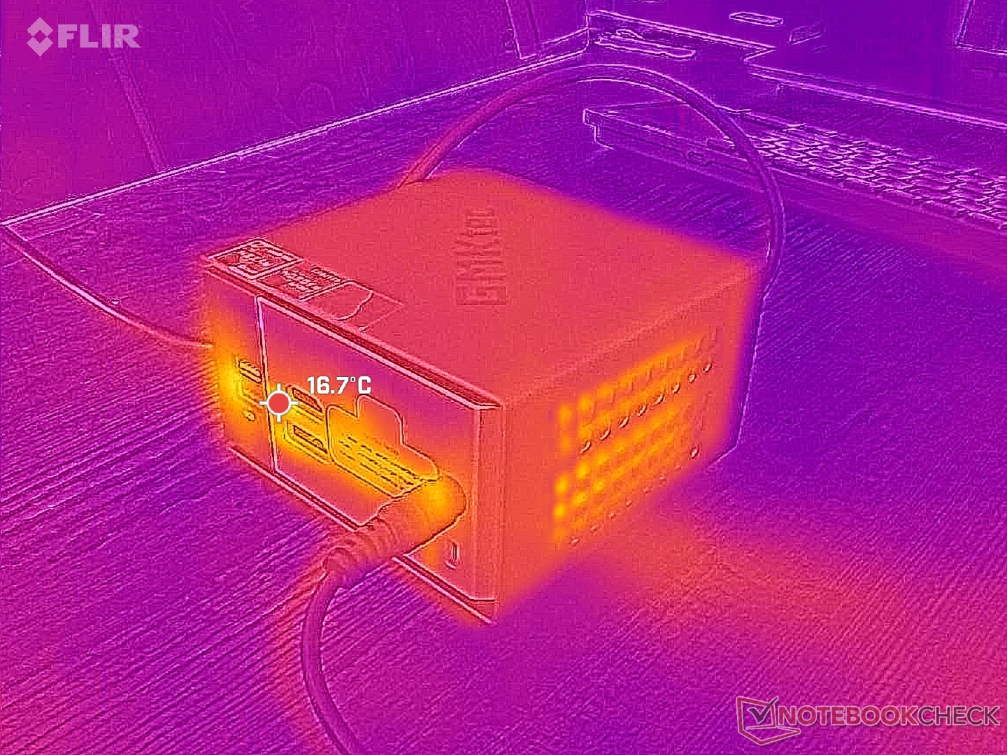 Conseguimos medir um consumo máximo de 80 W do adaptador CA de 120 W de tamanho médio (~13,3 x 5,8 x 3,2 cm).