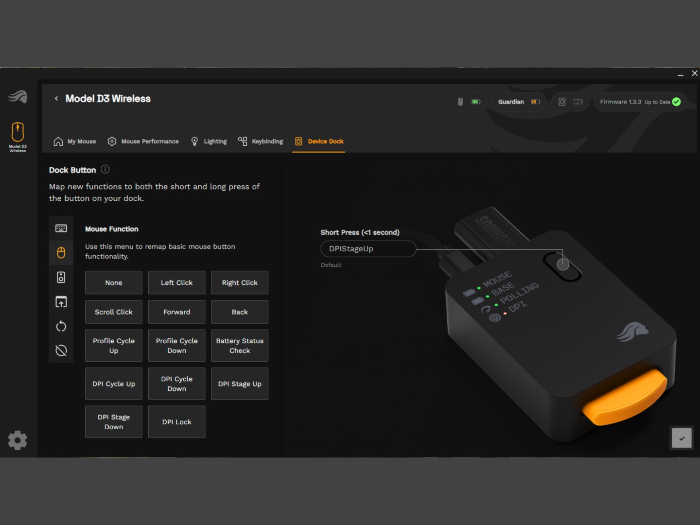 A base funciona como uma estação de conectividade e carregamento. Além de abrigar o dongle de 2,4 GHz, ela tem um slot para carregar a bateria sobressalente. Há também quatro indicadores LED para monitorar os níveis de bateria do mouse, a bateria sobressalente, bem como a taxa de polling e o DPI. A Glorious também adicionou um botão na base que pode ser personalizado por meio do software Core. Ele pode ser usado para iniciar aplicativos ou executar macros, o que é muito legal.