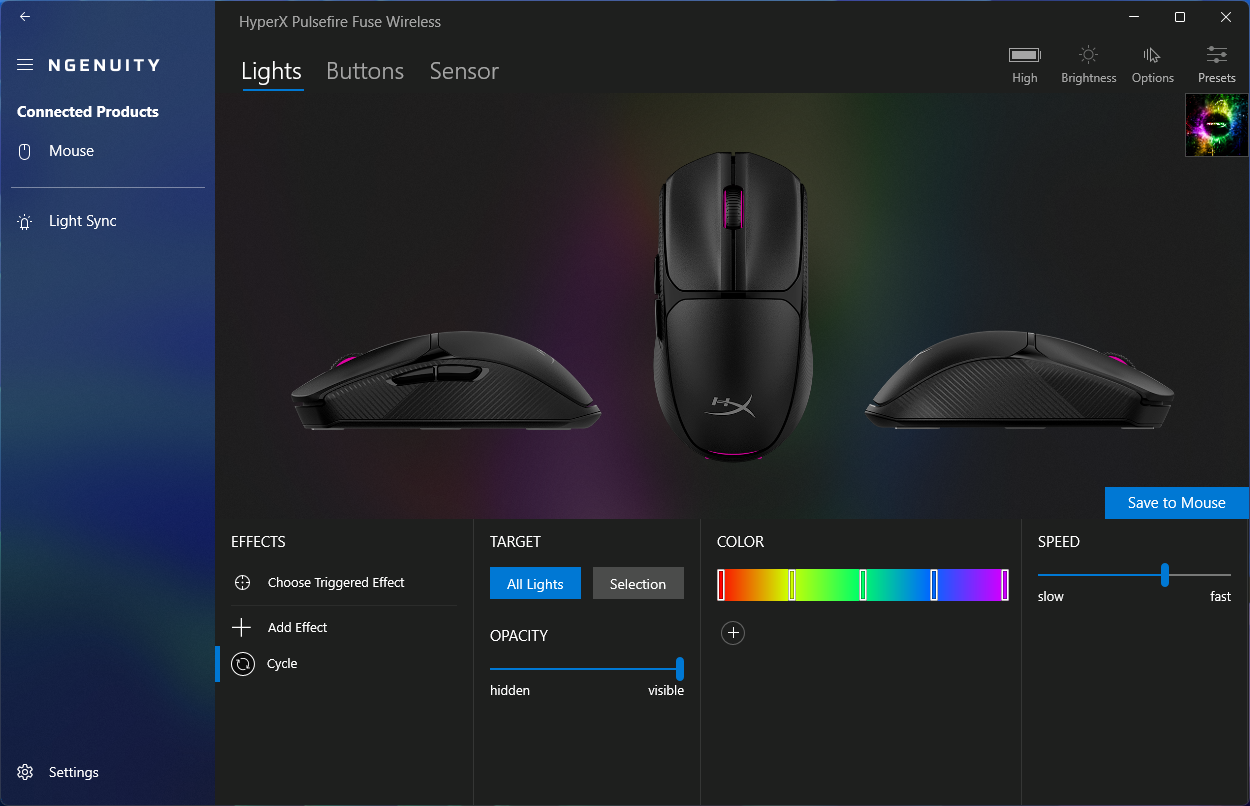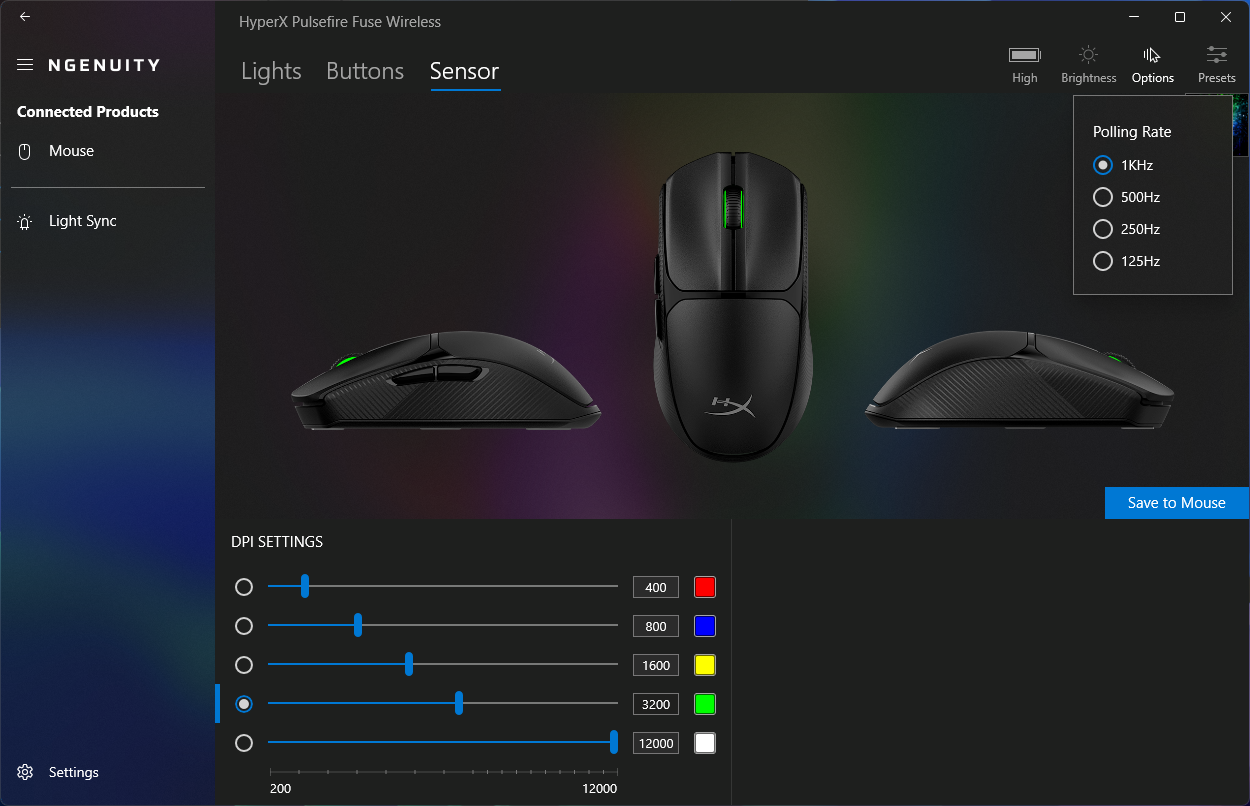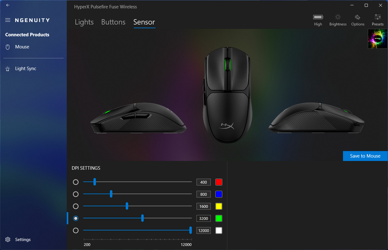 O Pulsefire Fuse Wireless funciona imediatamente, sem necessidade de software adicional. Para aqueles que querem mais controle, o aplicativo HyperX Ngenuity oferece personalização RGB e sincronização de dispositivos HyperX, remapeamento de botões, ajustes de taxa de polling, até cinco modos DPI personalizados e um armazenamento de predefinições integrado.