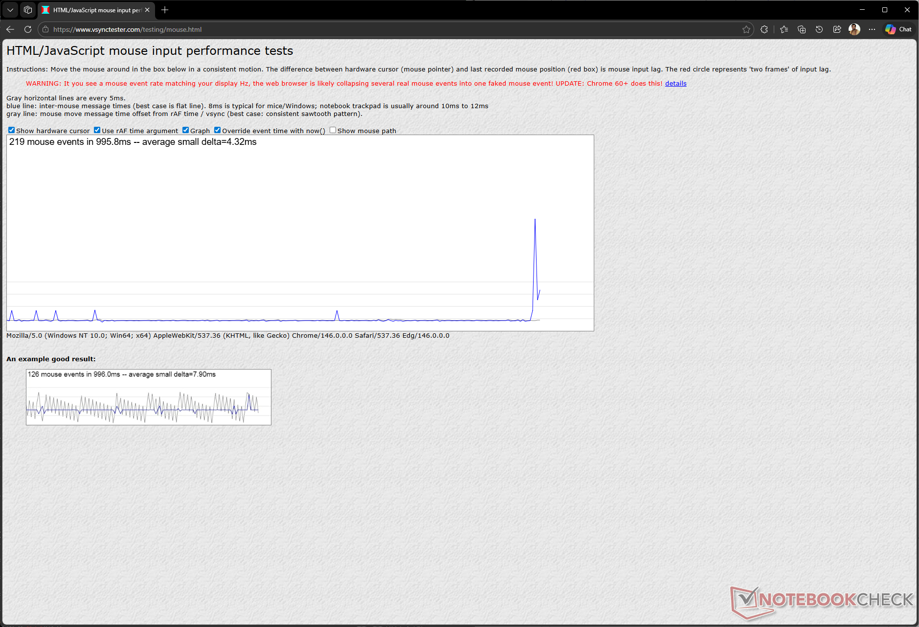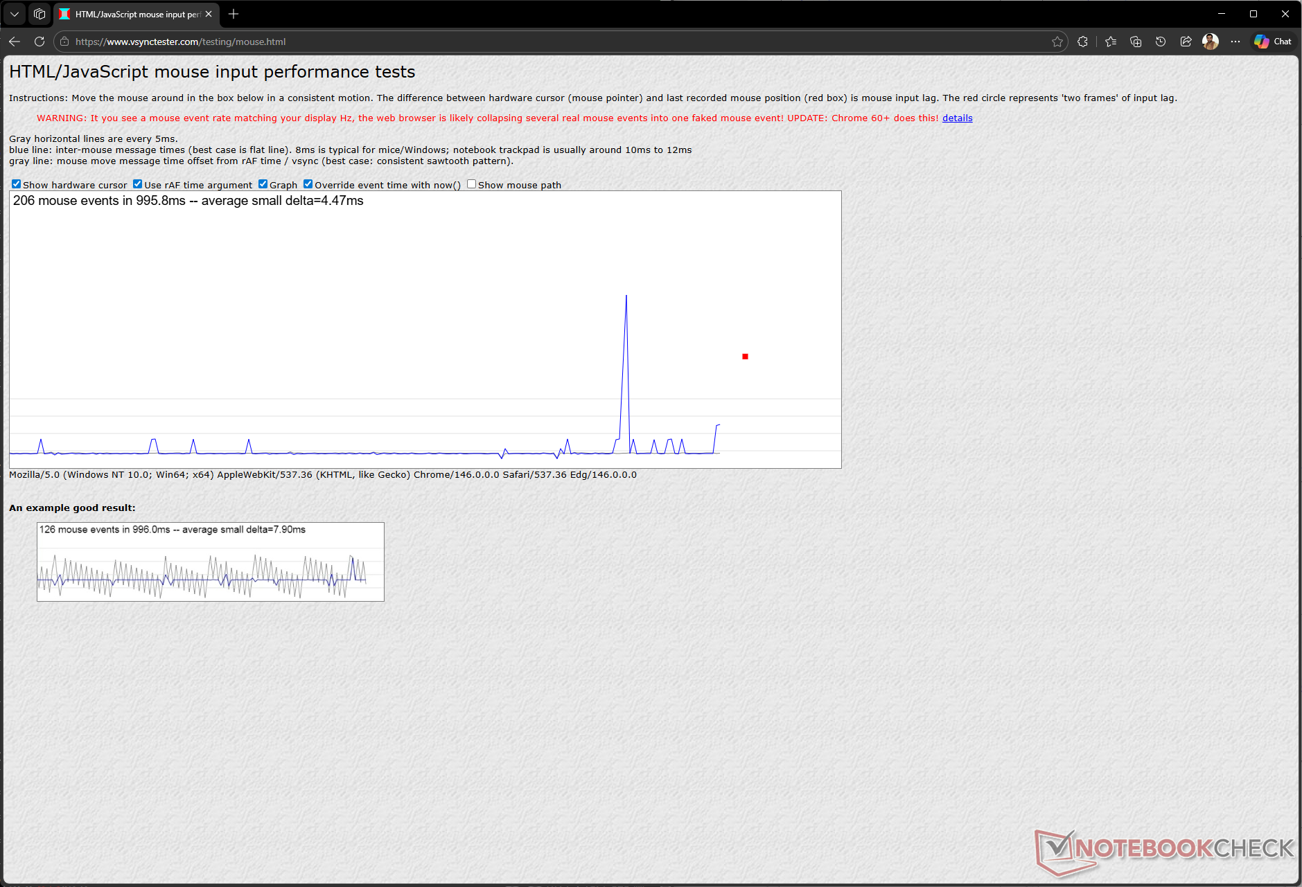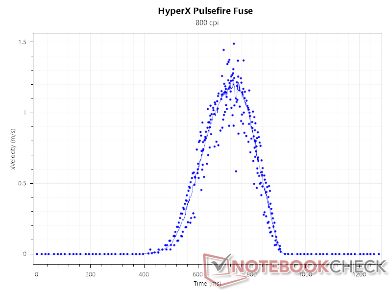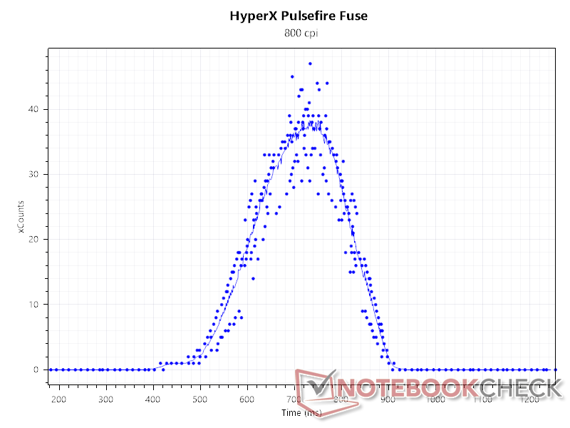 Vários parâmetros do sensor foram avaliados a 800 DPI (jogos típicos de FPS), 3.200 DPI (uso típico de desktop em um monitor de alta taxa de atualização) e 12.000 DPI (o máximo do sensor).