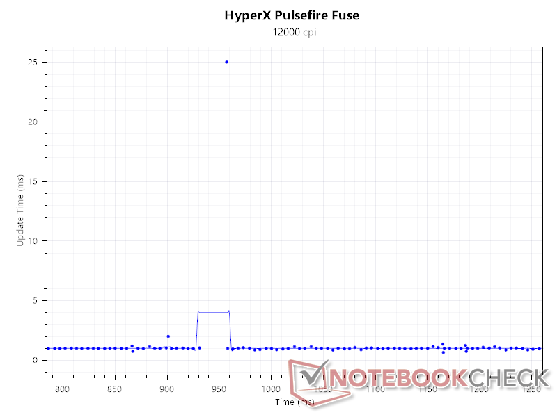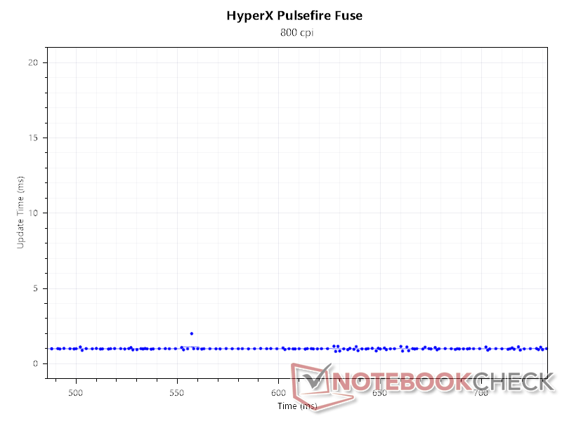 De acordo com os gráficos de taxa de sondagem acima, verificamos que o intervalo de atualização é consistentemente de 1 ms a 1.000 Hz e 800 DPI.