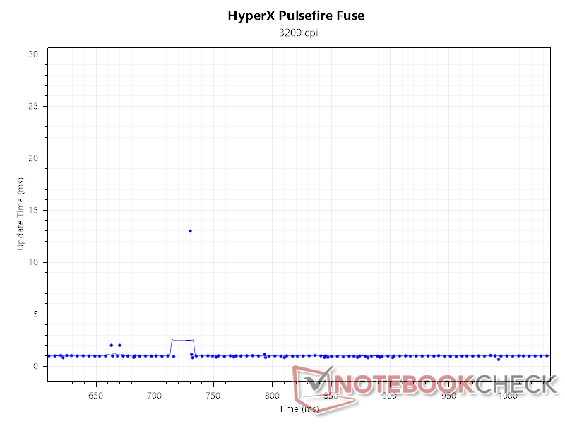 Embora haja algumas quedas de frequência, especialmente em DPIs mais altos, elas não afetaram os jogos práticos porque as quedas geralmente duram menos de 40 ms e os movimentos do mouse no mundo real são mais aleatórios e em distâncias mais curtas.