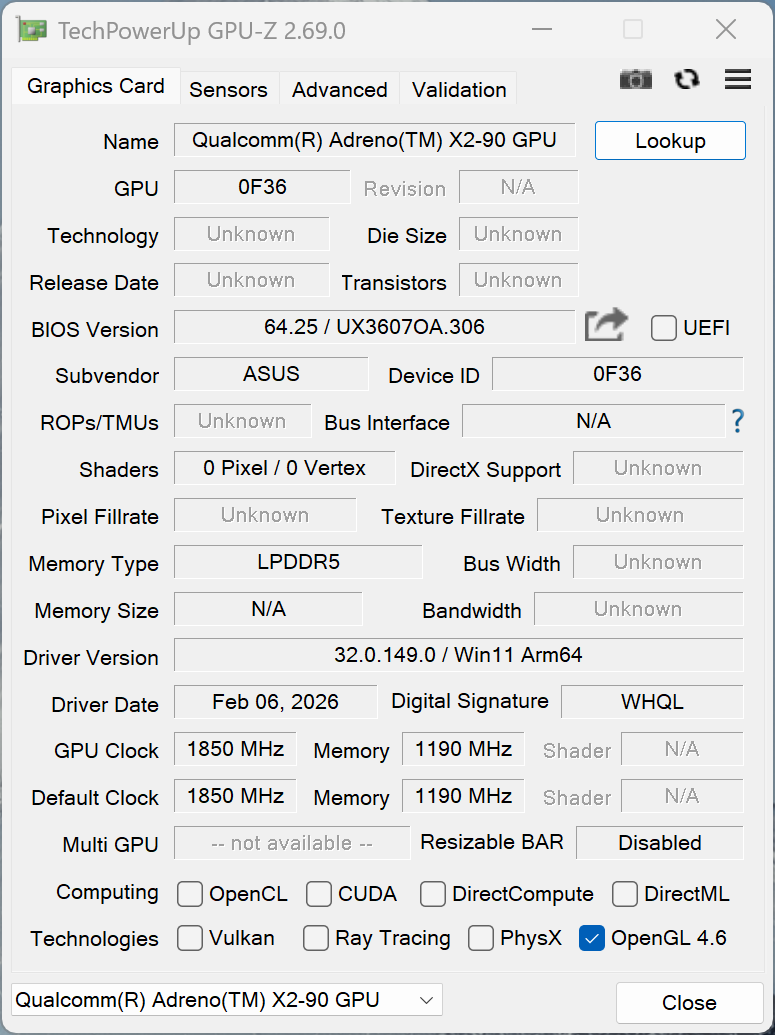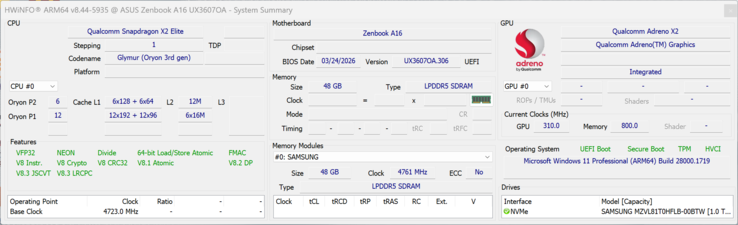 | Asus Zenbook A16 UX3607 Qualcomm Snapdragon X2 Elite Extreme X2E-94-100 ⎘ Qualcomm Adreno X2-90 ⎘ 48 GB Memória, 1000 GB SSD | 1.2 kg | 16.5 mm | 16.00" 2880x1800 212 PPI OLED | ||