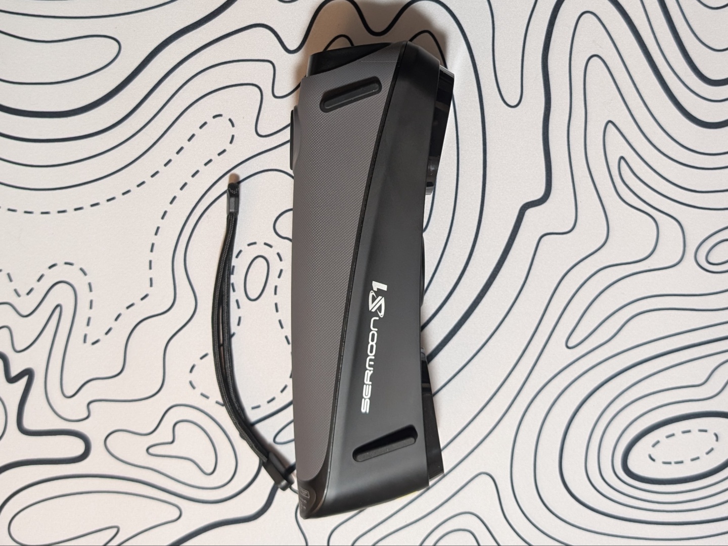 Seguindo o design portátil da série Raptor de scanners 3D, a Creality manteve o mesmo fator de forma e formato geral com o Sermoon S1. Ele parece sólido na mão e a empunhadura de borracha torna-o confortável de segurar. Há um suporte fixado na parte inferior para garantir que o scanner não caia, mas nunca tivemos esse problema. Há também uma porta USB Type-C com trava na parte inferior para garantir uma conexão estável durante a digitalização.