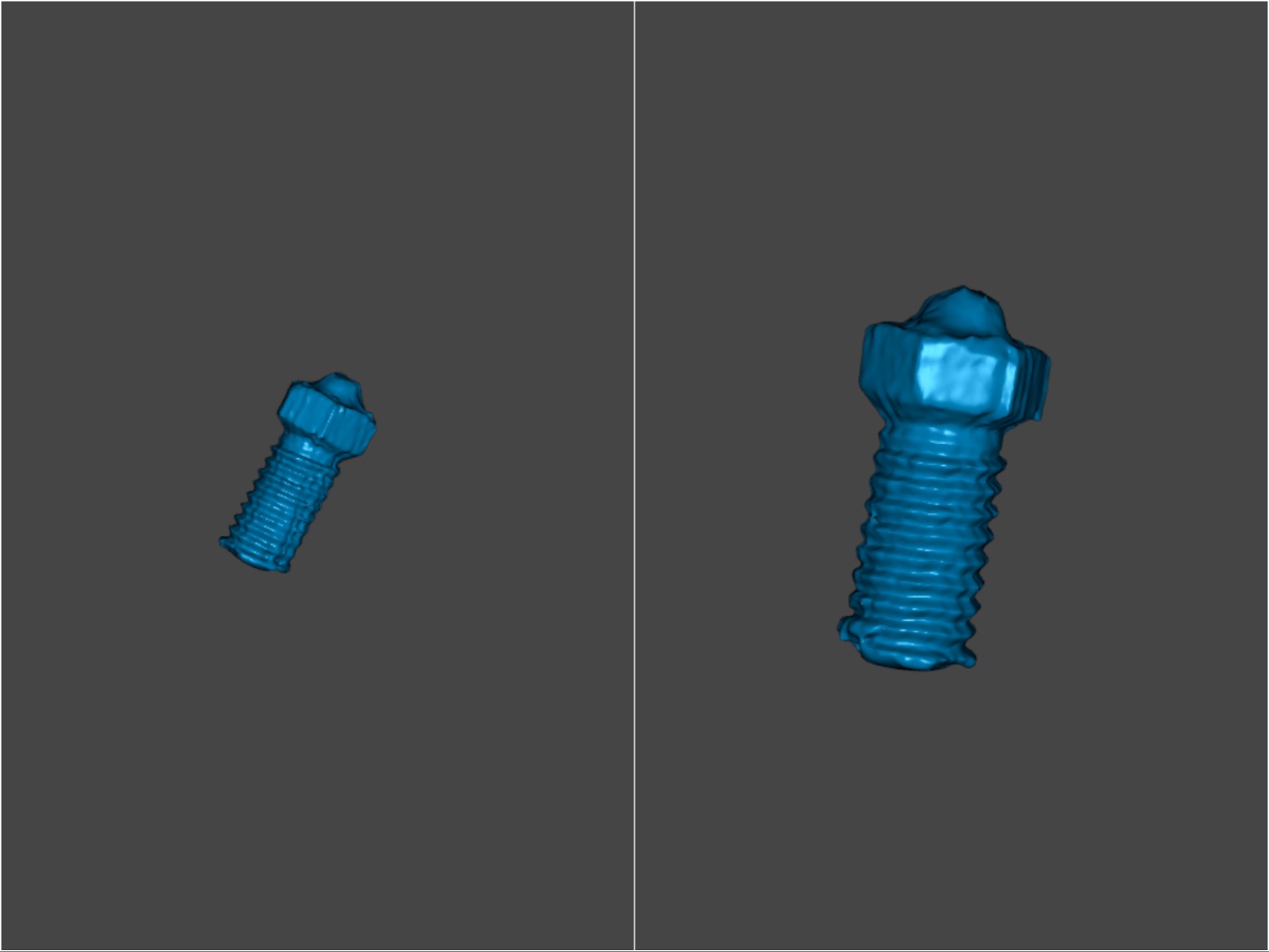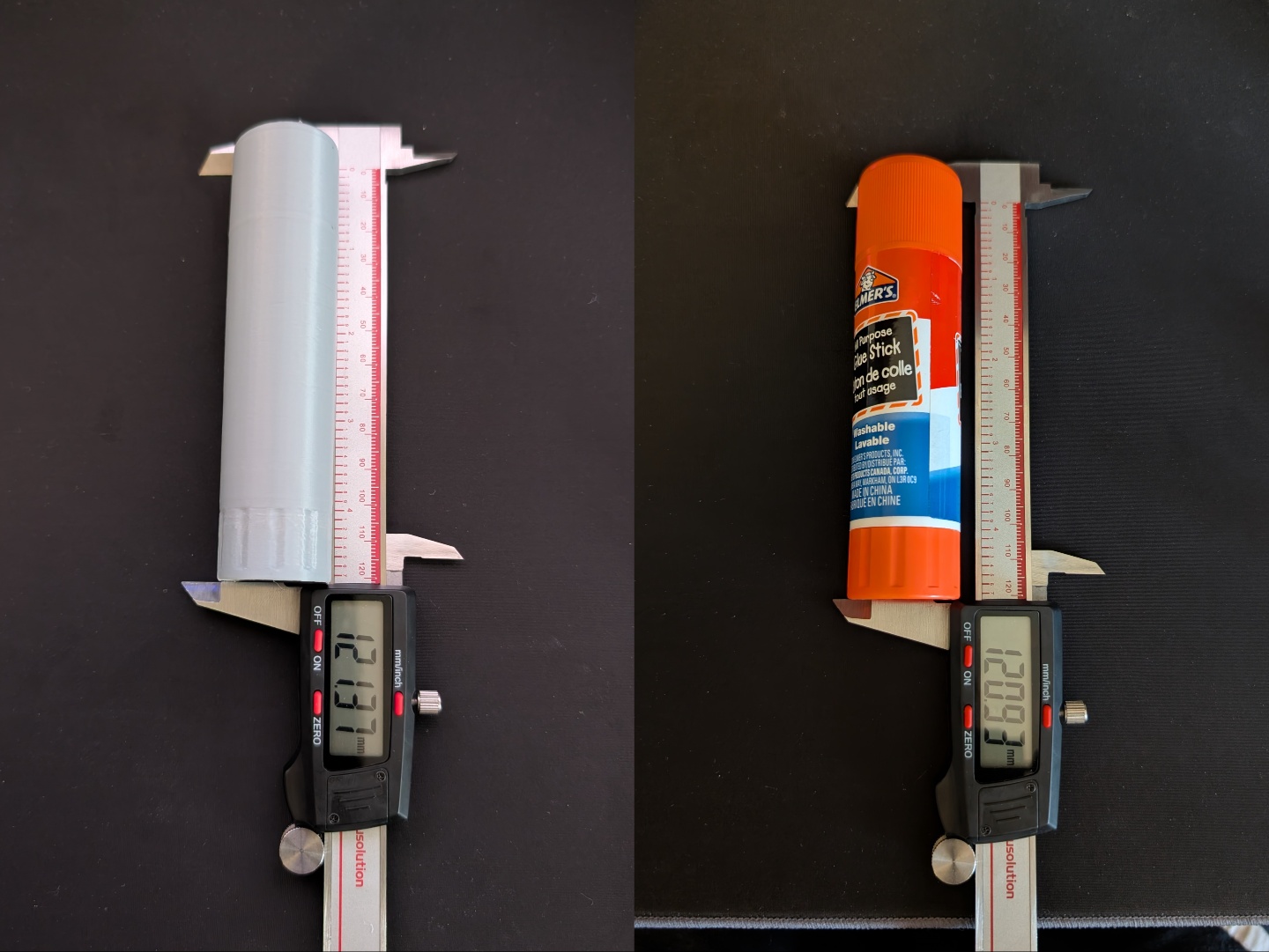 Dito isso, os resultados foram muito mais precisos com formas e objetos individuais. O bastão de cola foi digitalizado usando uma combinação de laser paralelo e único e, em seguida, impresso em 3D. Como pode ser visto nas imagens abaixo, a parte rasa estava dentro da precisão reivindicada, enquanto a parte mais profunda estava com um desvio de 0,03 mm. O diâmetro estava errado em 0,04 mm, mas a altura estava errada em 0,24 mm, considerando que há uma camada de borda de 0,2 mm na impressão.