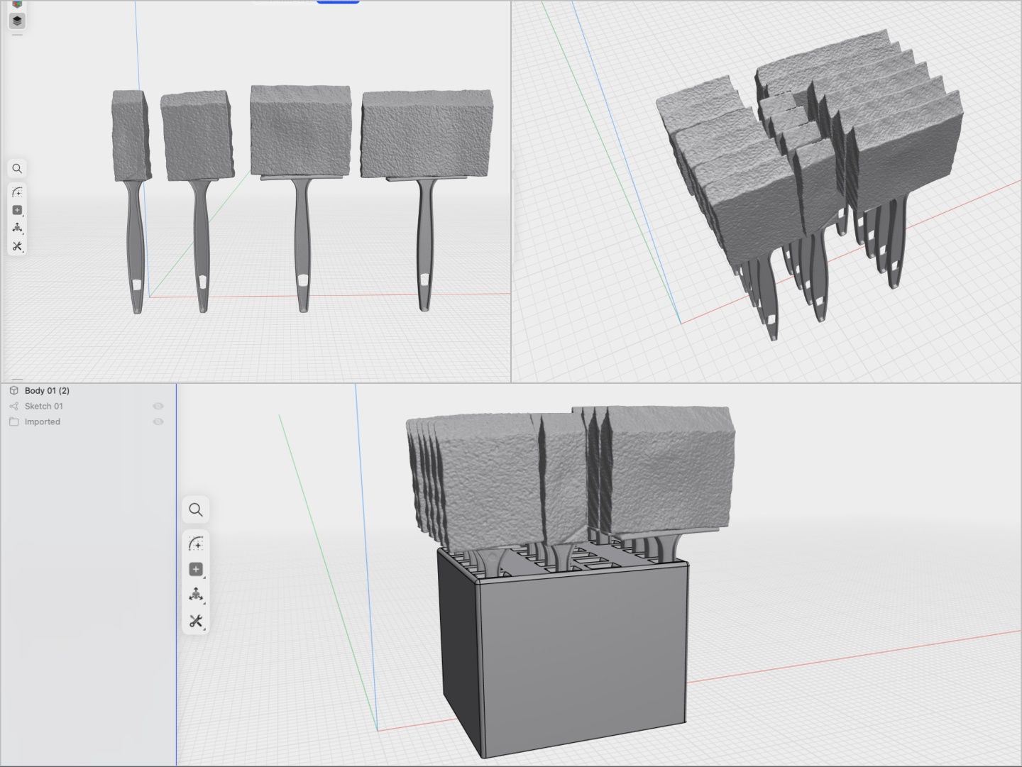 Para usos mais práticos e organizacionais, consegui projetar um suporte para alguns pincéis de malha que eu tinha por aí. Ter um modelo 3D dos pincéis de tamanhos diferentes ajudou a visualizar como eles ficariam em um espaço 3D de acordo com meus requisitos de design. O Creality Scan, assim como outros softwares de digitalização 3D, tem um recurso de alinhamento em que duas metades digitalizadas podem ser mescladas para formar um modelo completo. Isso ajudou a criar modelos 3D precisos para os pincéis. Em seguida, também consegui fazer um design rápido para um suporte de mouse para organizar minha mesa, digitalizando a parte inferior do mouse, e passei da digitalização para o design e para um protótipo impresso em menos de 30 minutos.