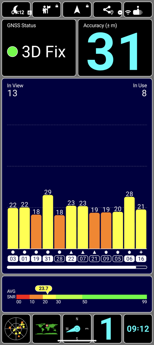 O Pixel 10 Pro usa GNSS de banda dupla para posicionamento, que suporta todos os sistemas globais de satélite. A fixação por satélite leva um tempo relativamente longo em ambientes internos e não é particularmente precisa. A recepção em ambientes externos, por outro lado, é rápida e altamente precisa.
