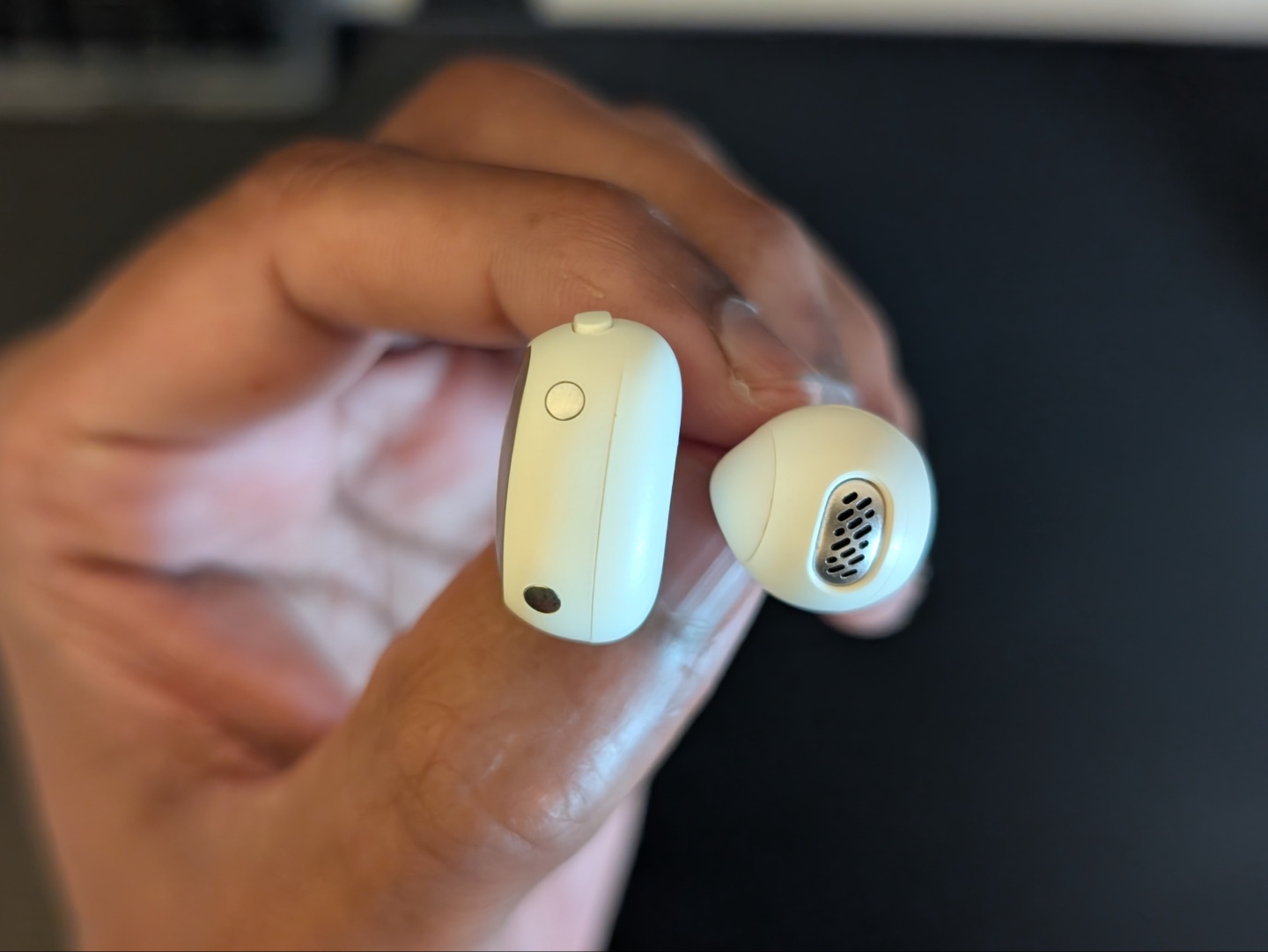 O botão físico é fácil de encontrar atrás da orelha e funciona muito bem. Uma vantagem do botão físico em relação aos controles por toque é que as pessoas com cabelos compridos não precisam tirá-lo do caminho e ele pode ser operado mesmo quando se usa algo como um gorro.