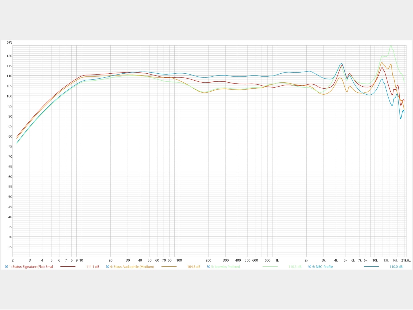 Para uma análise mais objetiva, fizemos algumas medições usando o sistema miniDSP EARS em combinação com o software de análise Room EQ Wizard (REW), como os senhores podem ver abaixo. Os resultados foram, mais uma vez, excelentes. Com a configuração de fábrica "Status Signature", os graves foram enfatizados, com médios um pouco mais fracos e agudos bem representados. Entretanto, ressonâncias fortes e indesejadas ocorrem em 4,5 kHz, 5,6 kHz e acima de 10 kHz. Com um equalizador personalizado, é possível chegar próximo dos valores ideais. A maioria dos usuários ficará mais do que satisfeita com o equalizador padrão, mas os entusiastas ficarão satisfeitos em saber que há ainda mais potencial no Status Pro X.