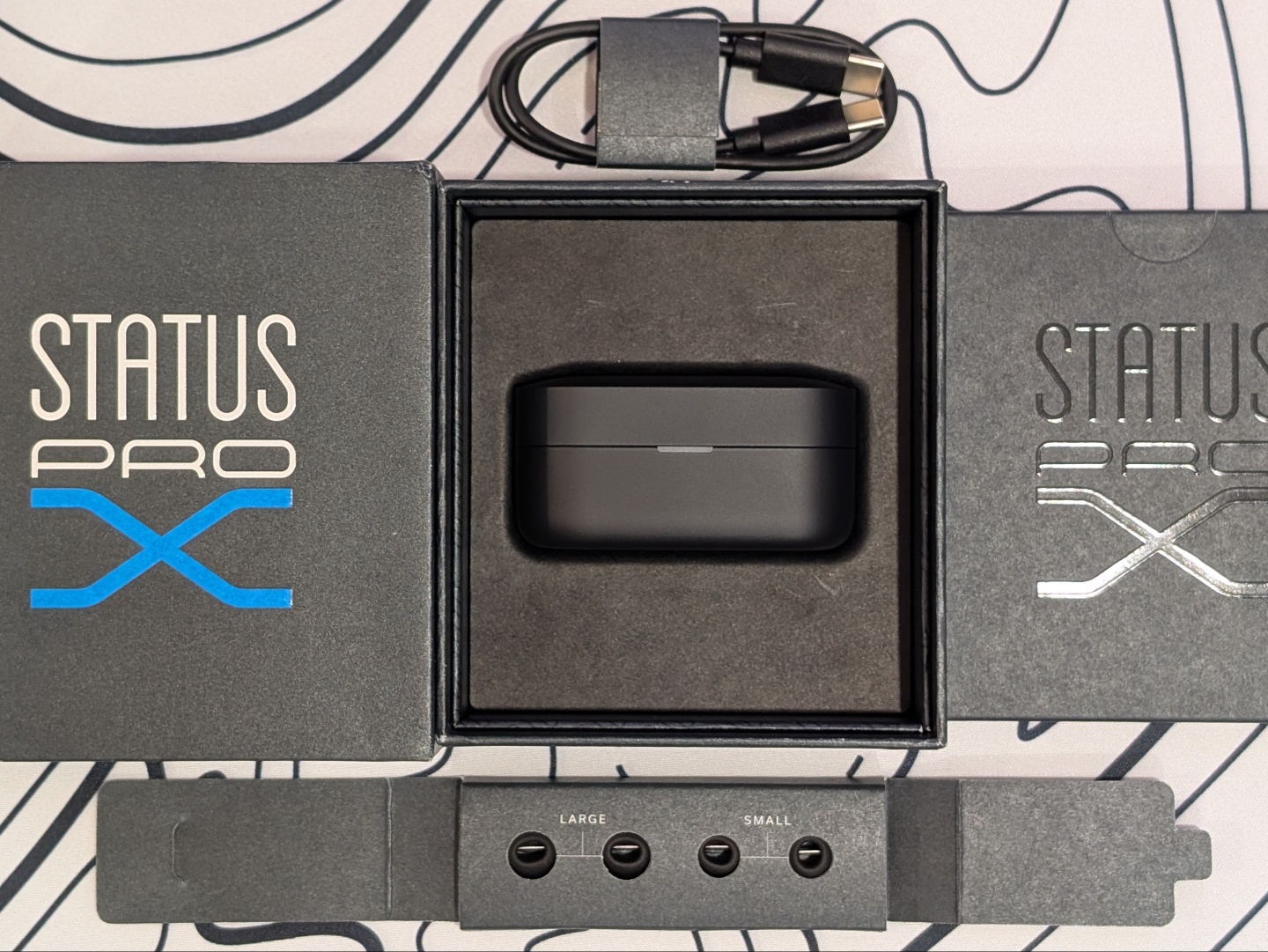 Os Pro X são embalados em uma pequena caixa que contém a documentação básica, um cabo de carregamento USB tipo C, um conjunto de tampões de ouvido de tamanhos diferentes e o estojo de carregamento compacto. Em comparação com o Baseus Inspire XP1 e o já compacto EarFun Air Pro 4+ o estojo do Pro X parece e é ainda menor.