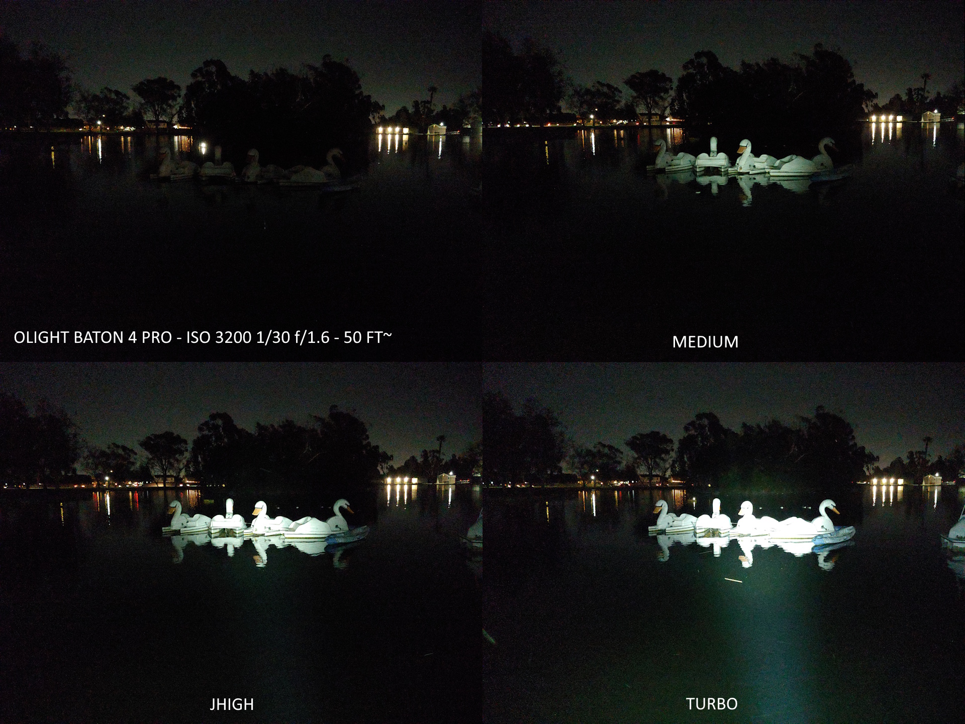 Os bastões foram testados em seus três modos mais brilhantes. Os barcos cisne estão a cerca de 15 m (50 pés) de distância.