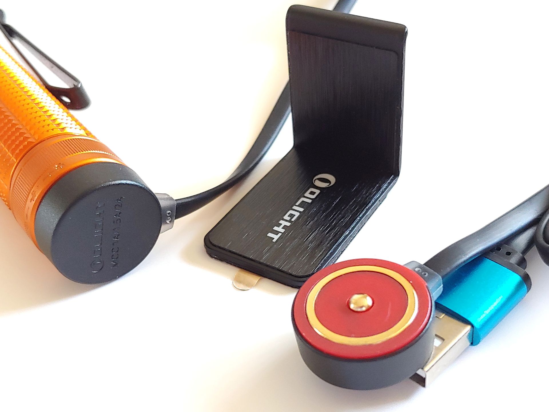 As caixas robustas incluem uma lanterna com um cartão de leitura, um manual e um carregador magnético. Um suporte de aço em forma de L com fita adesiva está incluído como uma base para a lanterna.