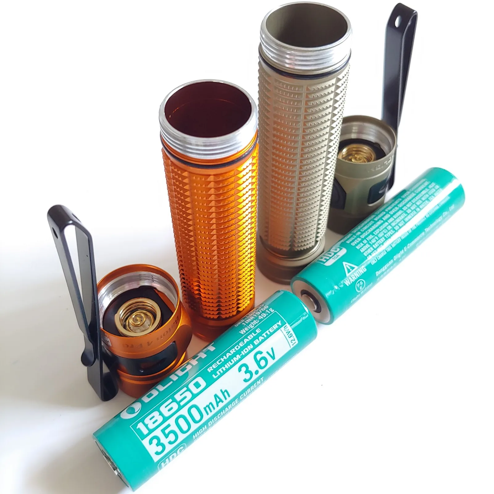 O Olight Batons apresenta um corpo de alumínio serrilhado com um interruptor lateral e um interruptor de cauda. Um clipe de metal é fixado na lateral, permitindo que os Batons sejam presos em roupas e mochilas.