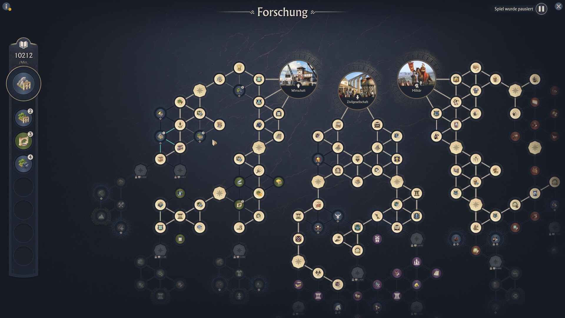 Outra nova e poderosa mecânica de jogo é o sistema de pesquisa. Ele é importante desde o início e fornece acesso a melhorias de construção e opções de aliança, entre outras coisas. A árvore de pesquisa é dividida em três ramos: economia, sociedade civil e militar. As tecnologias avançadas estão fortemente ligadas aos marcos. Além de gerar uma certa quantidade de conhecimento, os jogadores também devem atender a requisitos específicos, como construir várias minas ou aquedutos ou atingir determinados níveis de população.