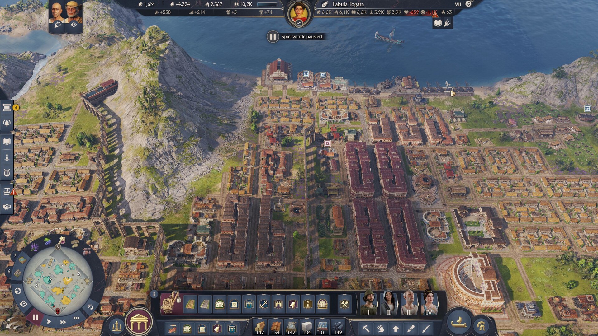 Isso significa que o Anno 117 se torna um jogo de quebra-cabeça e incentiva ativamente a integração dos edifícios de produção à cidade principal. Isso cria variedade visual e evita que os assentamentos pareçam muito uniformes. No entanto, a nova edição do Anno perde a oportunidade de criar verdadeiras áreas de uso misto. Na Roma antiga, havia edifícios em que oficinas e lojas ocupavam o primeiro andar. Isso provavelmente exigiria um sistema de construção modular, mas tornaria as cidades visualmente mais diversificadas e abriria novas possibilidades. Fiel à tradição de Anno, a densidade populacional aumenta a cada nível de civilização, de modo que os patrícios não vivem mais em casas domus espaçosas, mas em elegantes edifícios altos.