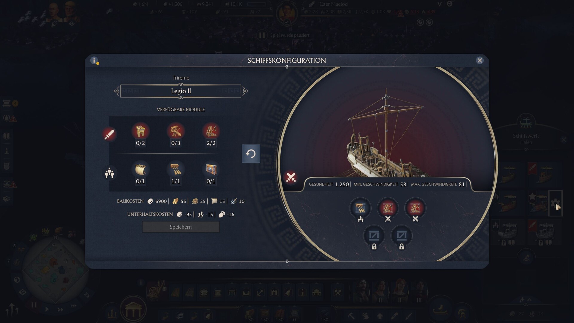 O combate naval se beneficia do design modular dos navios. Dependendo do navio, vários módulos podem ser acoplados para torná-lo mais eficaz contra edifícios, por exemplo. Durante nossa análise, conseguimos eliminar um dos piratas mais fracos e outro pretor da IA por meio de combate terrestre. Seu irmão pirata mais forte em Latium concordou com uma trégua após batalhas dispendiosas, mas com a desaprovação do imperador. Nossas ações não afetam apenas as relações com outros governantes, mas também influenciam nossa posição com o imperador, o que pode levar à guerra no pior dos casos.