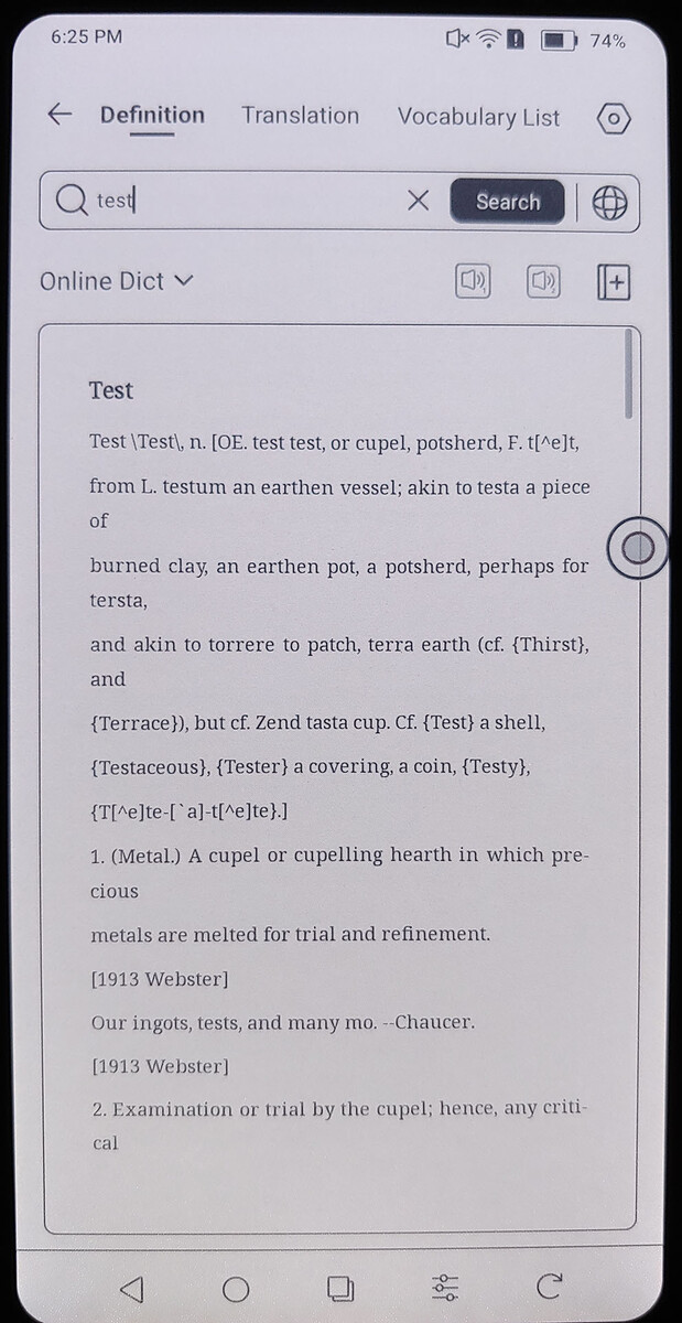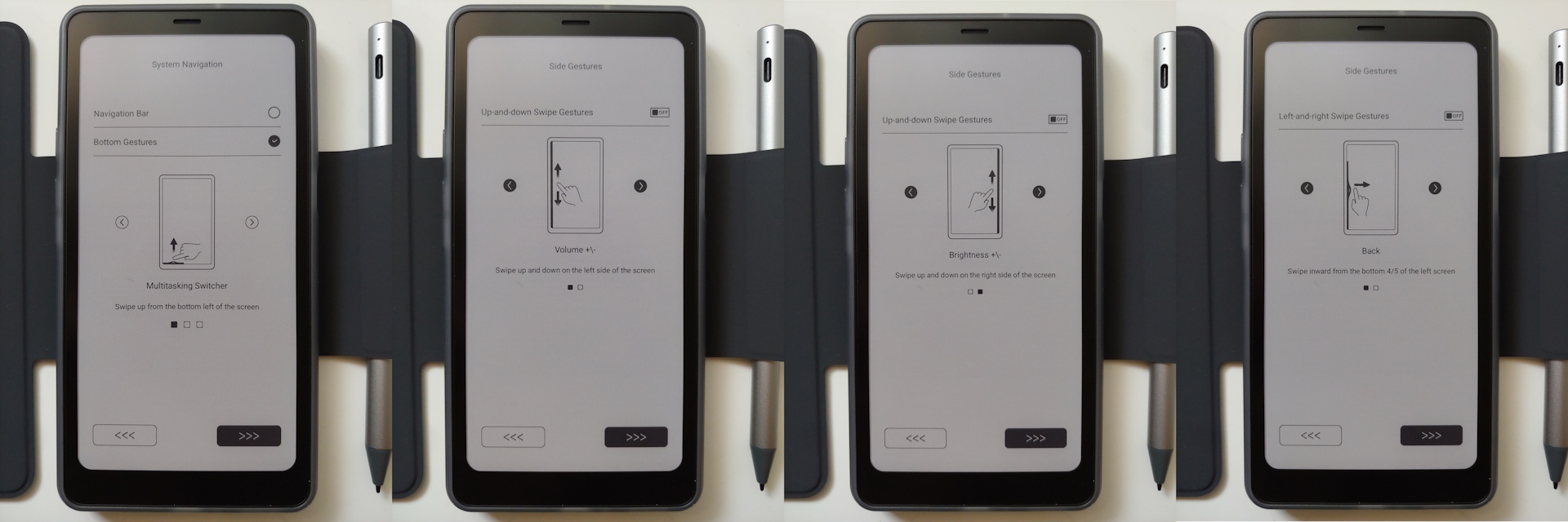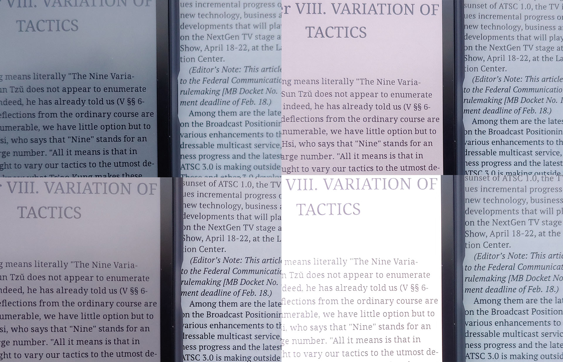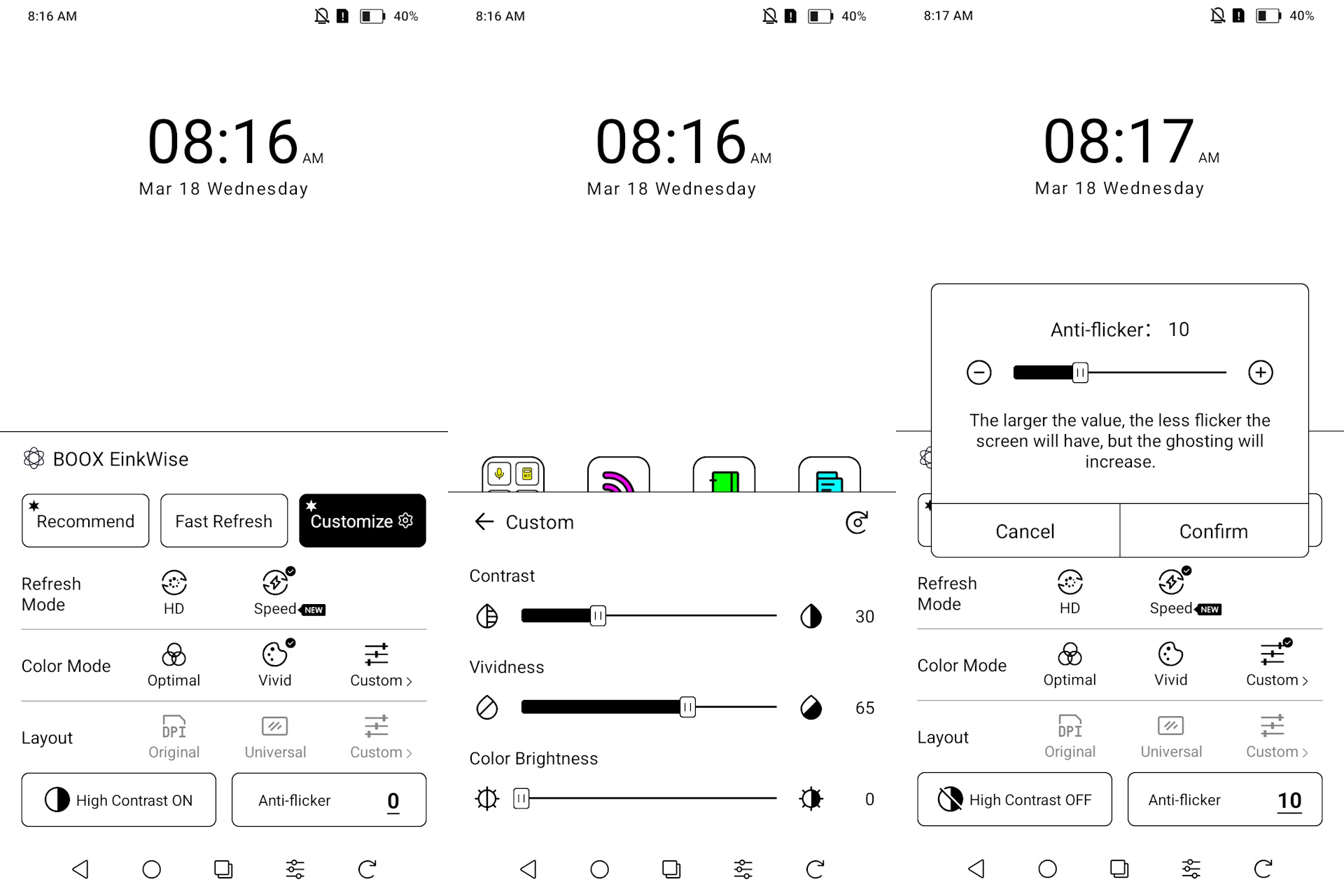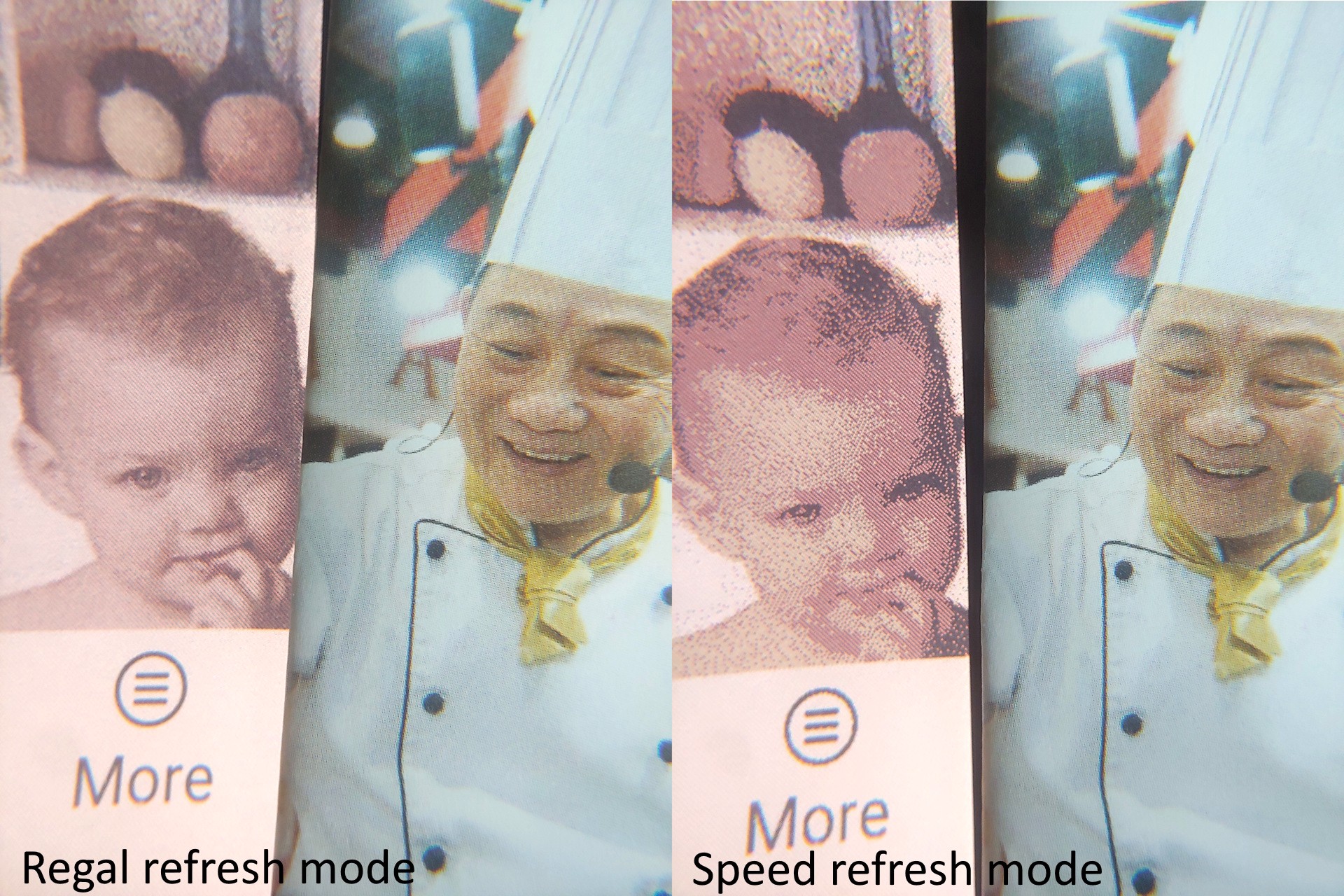 O modo de atualização rápida permite a rolagem rápida, mas reduz a qualidade visual, enquanto os modos Regal e HD melhoram a nitidez ao custo de interações mais lentas e ocasionais flashes invertidos. A qualidade se aproxima dos níveis de jornal nos modos mais altos e torna-se visivelmente mais áspera no modo Speed.