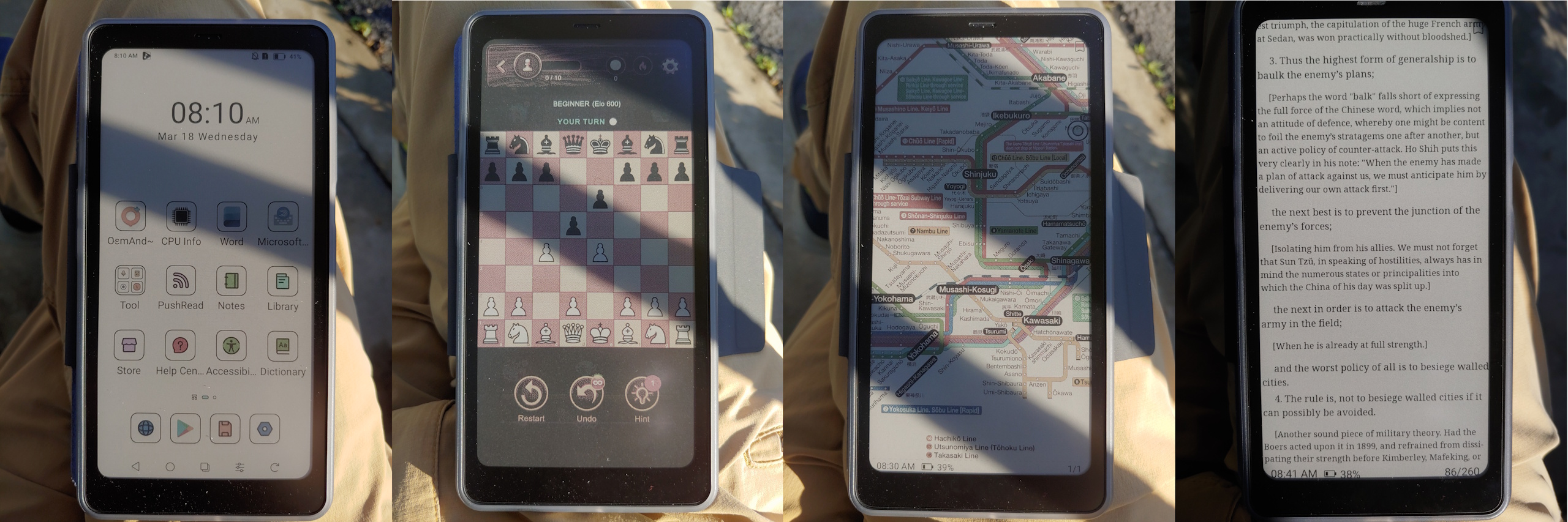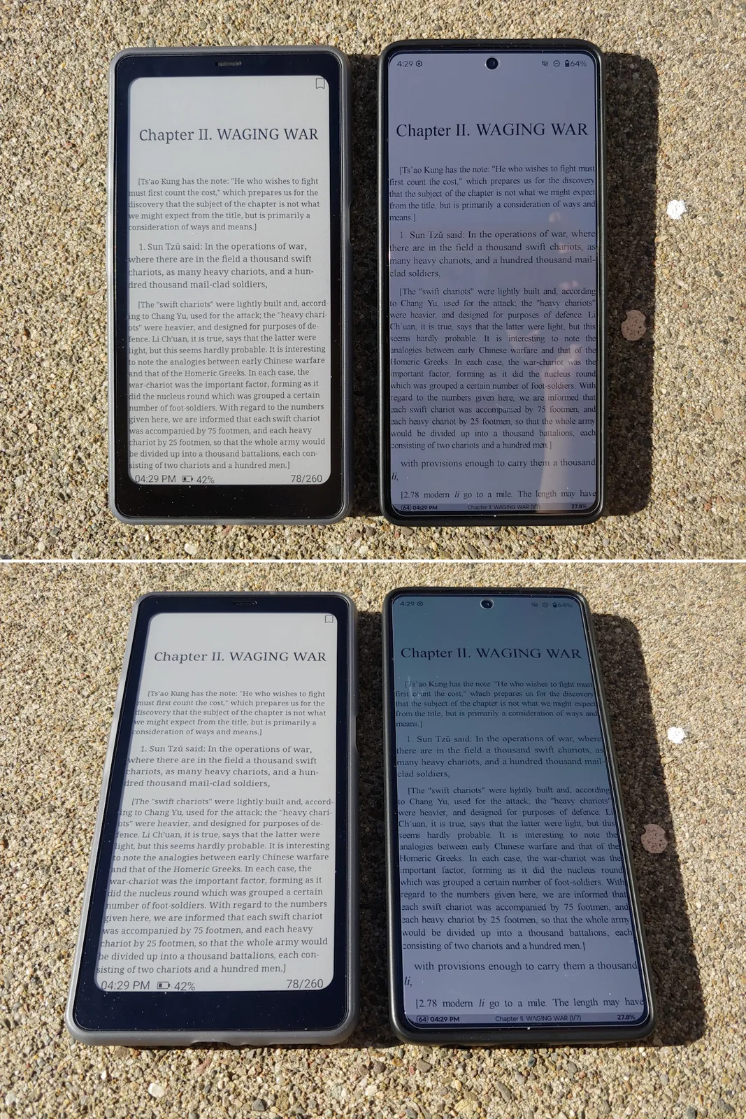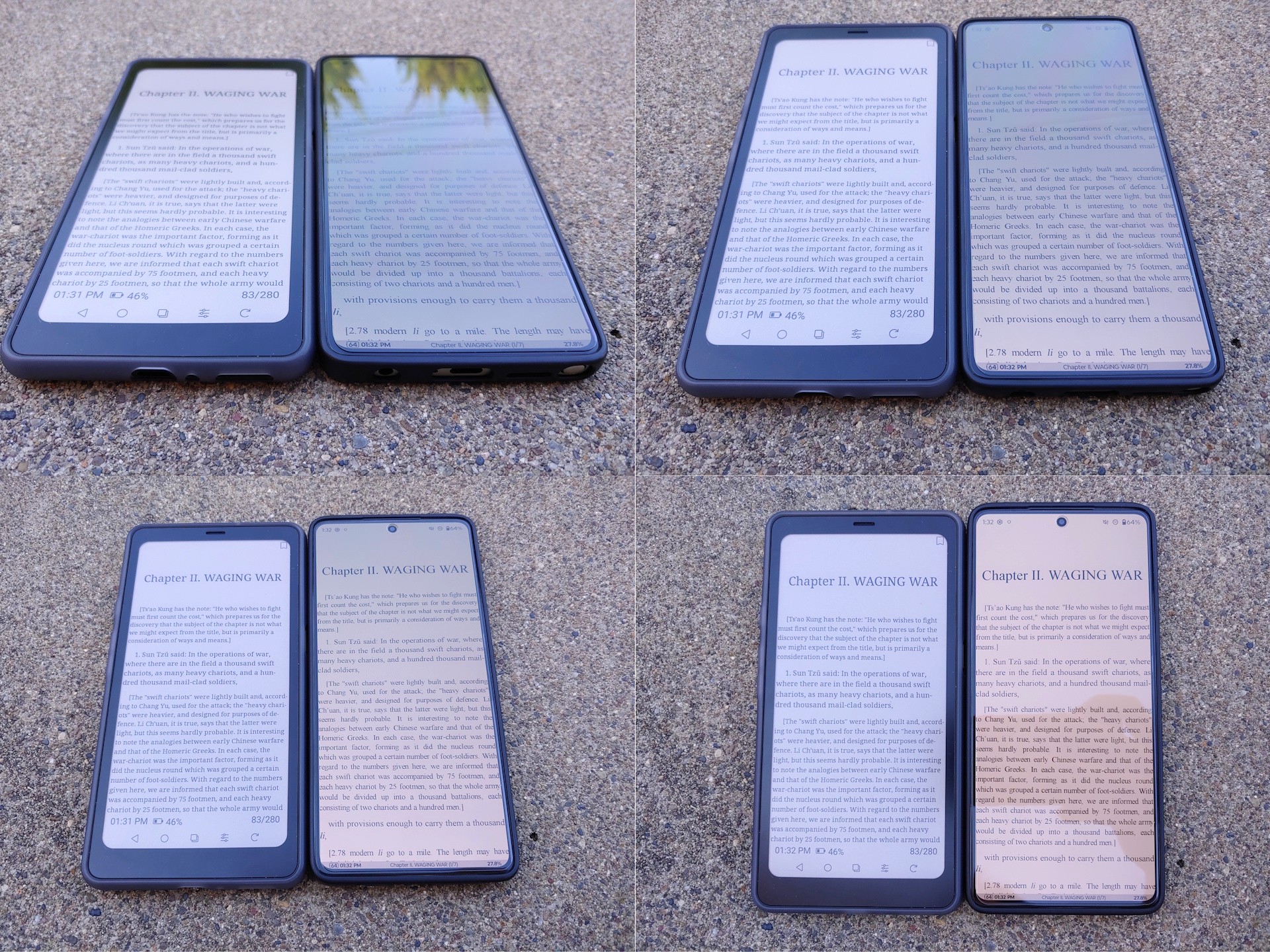 Sob sol direto, a tela do Kaleido 3 é muito mais legível do que a do Moto G Stylus 2024 OLED com seu brilho automático máximo de 1.200 nits. Na sombra, ambas as telas têm brilho semelhante quando o Moto é ajustado para o máximo manual de ~550 nit. O painel E Ink também permanece legível em qualquer ângulo, sem os reflexos ou mudanças de cor do OLED.