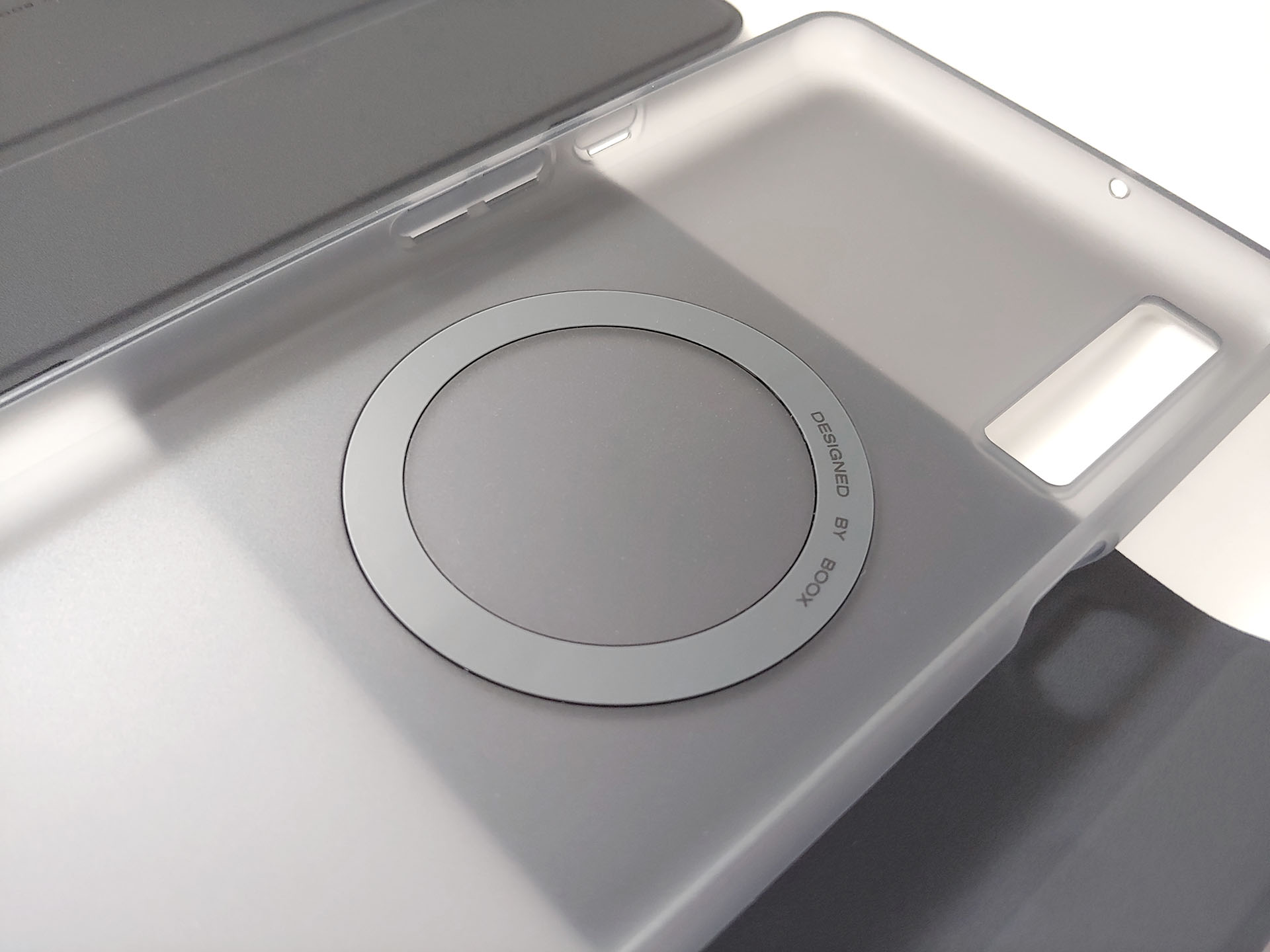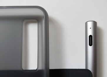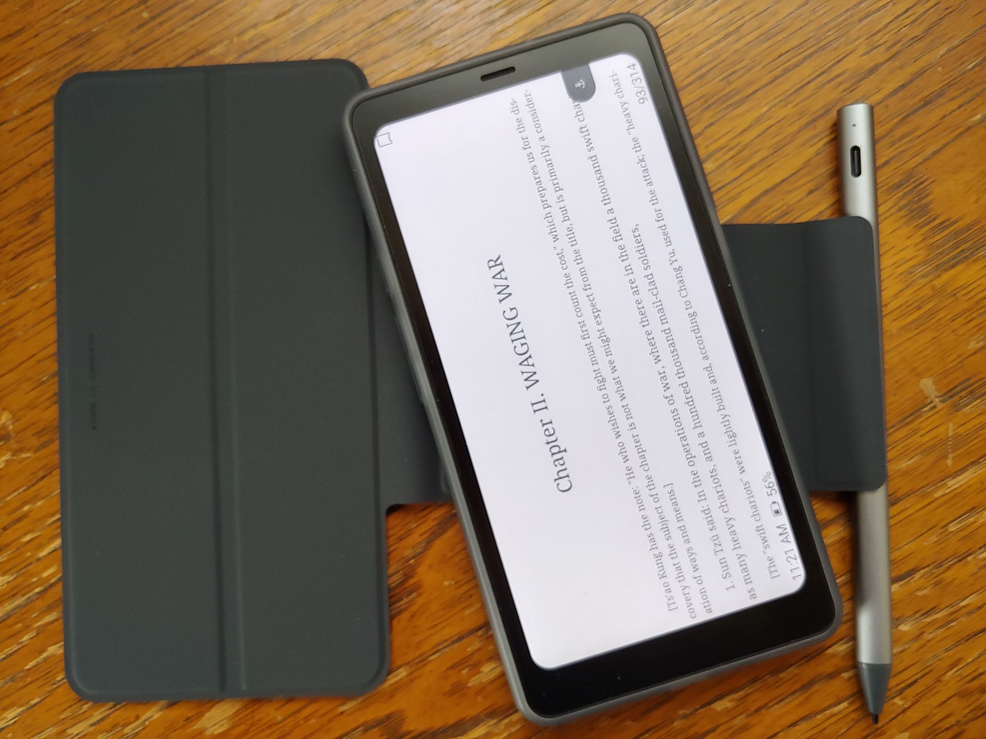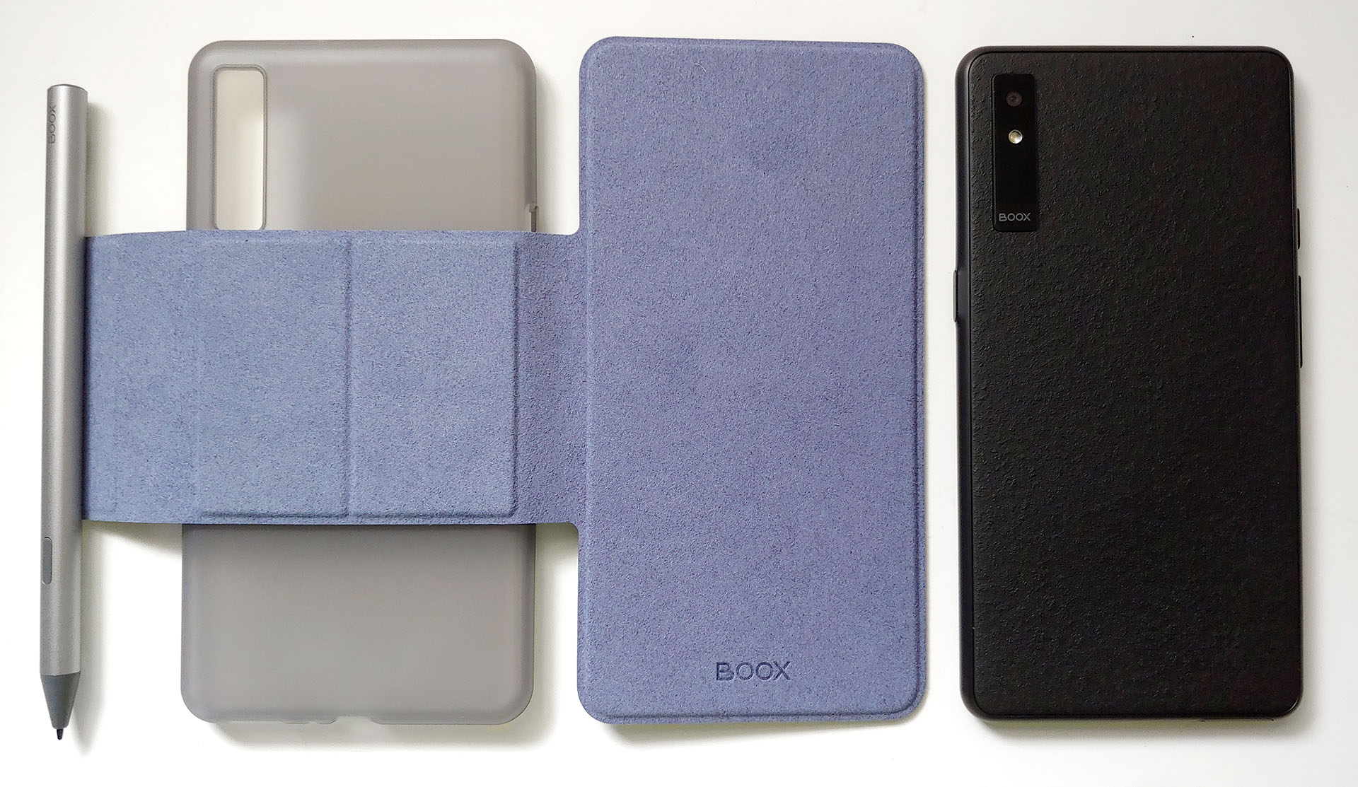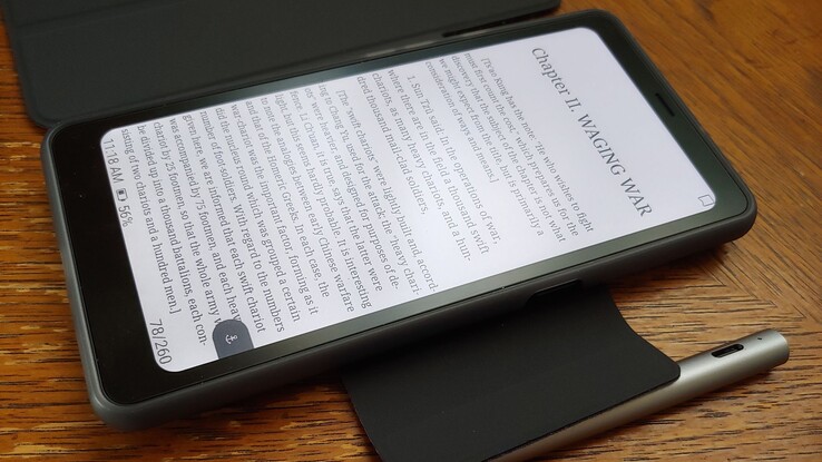 O e-reader funciona com uma caneta magnética e um estojo. A caneta se prende à parte traseira do Boox ou à aba da capa. O Boox se encaixa no estojo de plástico e depois se prende magneticamente à tampa, que também pode se soltar com bastante facilidade.