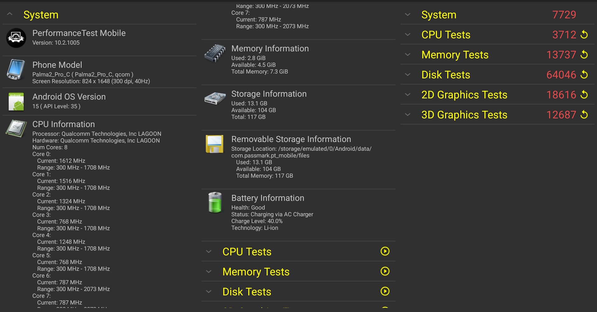Os benchmarks do PassMark sugerem que o desempenho é comparável ao de um Samsung S10 ou A52.