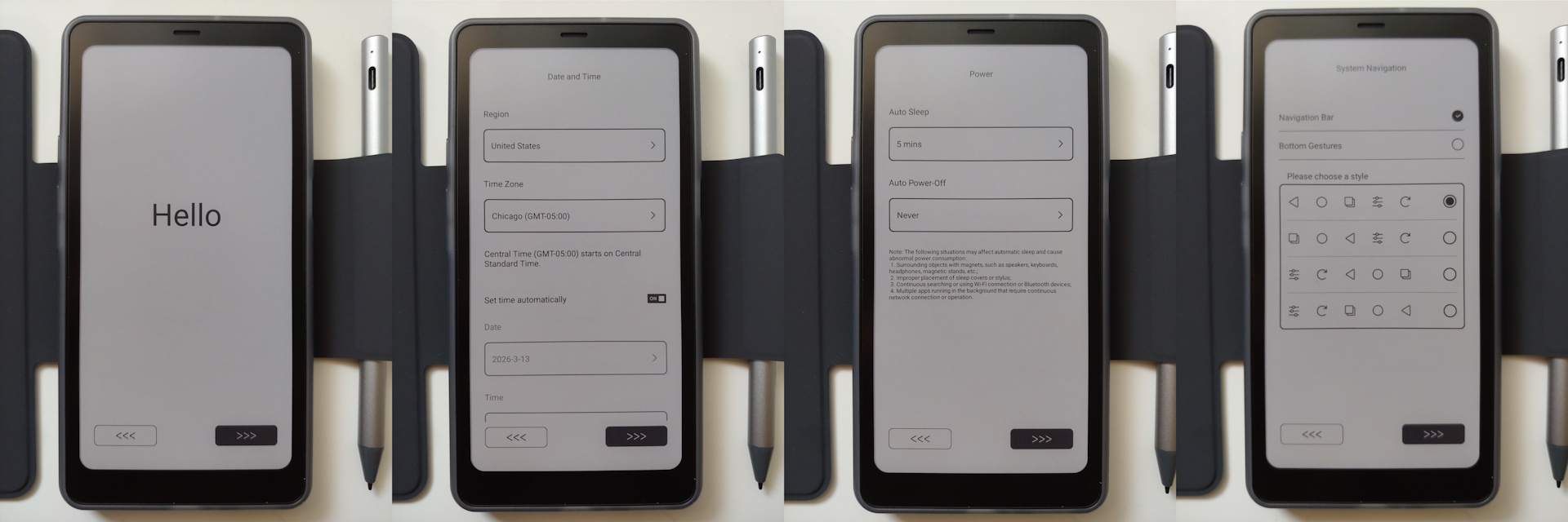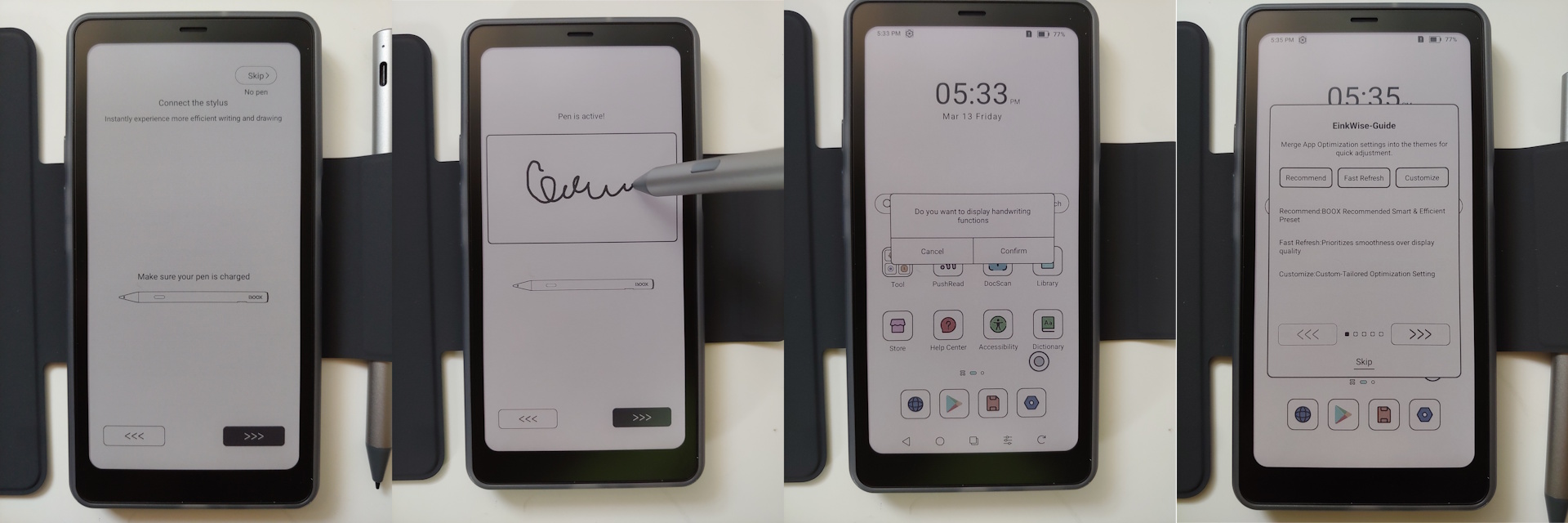 A configuração foi rápida, com avisos de idioma, hora, GUI, configuração da caneta e um tutorial do EinkWise antes de chegar à tela inicial. Não é necessário ter uma conta do Google, embora o AI Assistant exija uma conta Onyx.